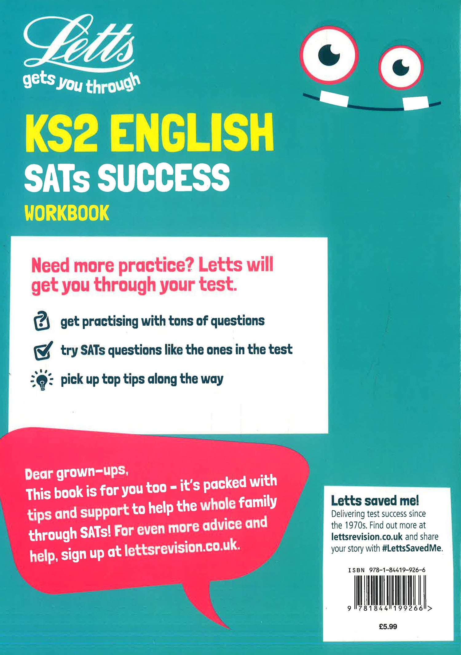 Need more practice? This Letts KS2 English SATs Practice Workbook will help your pupils do their very best. Get practising with tons of Key Stage 2 English SATs questions like the ones on the test and pick up top tips along the way. This workbook has been made ready for the 2020 tests, so your children can be too! Our KS2 English SATs Revision Guide (9781844199235) is also available for more SATs success.