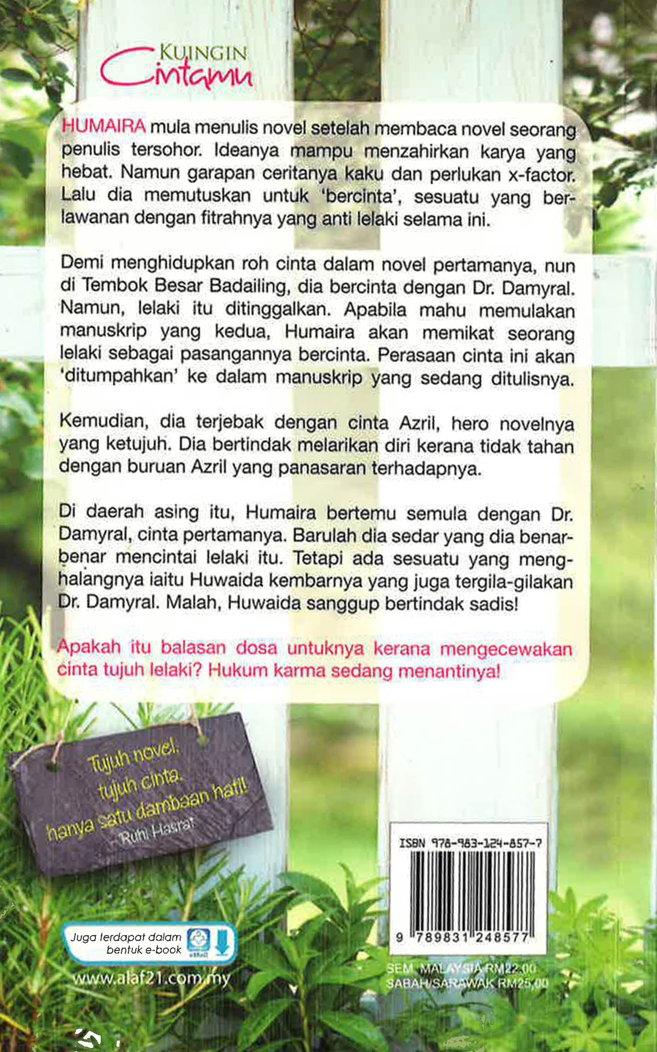 Humaira mula menulis novel setelah membaca novel seorang penulis tersohor. Ideanya mampu menzahirkan karya yang hebat. Namun garapan ceritanya yang kaku perlukan X-factor. Lalu dia memutuskan untuk ‘ber–cinta', sesuatu yang ber–lawanan dengan fitrahnya yang anti lelaki selama ini. Demi menghidupkan roh cinta dalam novel pertamannya, nun di Tembok Besar Badailing, dia bertemu Dr. Damyral. Namun cinta kilat itu putus. Seterusnya, bila memulakan manuskrip terbaru, Humaira akan memikat seorang lelaki sebagai pa–sangannya bercinta. Perasaan cinta ini akan ‘di–tumpahkan' ke dalam manuskrip yang sedang ditulis. Dia kemudian terjebak cinta dengan Azril iaitu hero novelnya yang ketujuh. Dia bertindak melarikan kerana tidak tahan de–ngan buruan Azril yang penasaran terhadapnya. Se–benarnya, Humaira fobia dengan perkahwinan kerana takut semua lelaki bersikap tidak adil seperti ayahnya. Di daerah asing itu dia bertemu semula dengan Dr. Damyral, cinta per–tamanya. Barulah dia sedar yang dia mencintai lelaki itu. Tetapi ada sesuatu yang menghalangnya iaitu Huwaida yang juga tergila-gilakan lelaki yang sama. Malah Huwaida sanggup bertindak sadis! Apakah itu ba–lasan dosa untuknya kerana mengecewakan cinta tujuh lelaki?