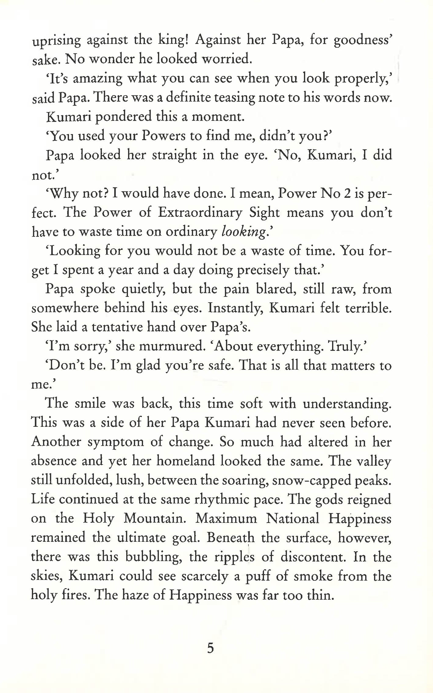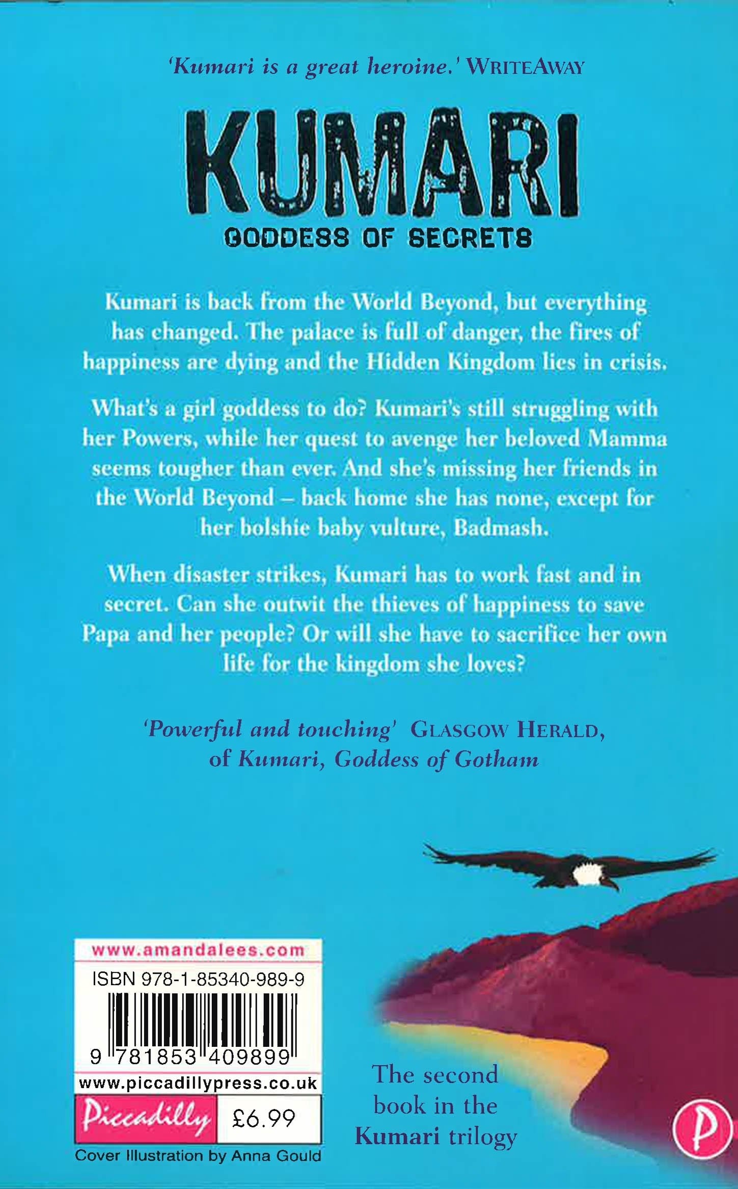 Kumari the girl goddess is back home after her year in New York, but everything has changed. It's hard to fit back into her old life at the Palace after everything she's learned in the World Beyond. More seriously, her father the King is very ill, and the future of the Hidden Kingdom is under threat. Kumari will need to marshall her goddess powers and use all her courage and ingenuity to find the secrets which will cure Papa and save the kingdom. And her quest to avenge her beloved Mamma seems destined to continue!