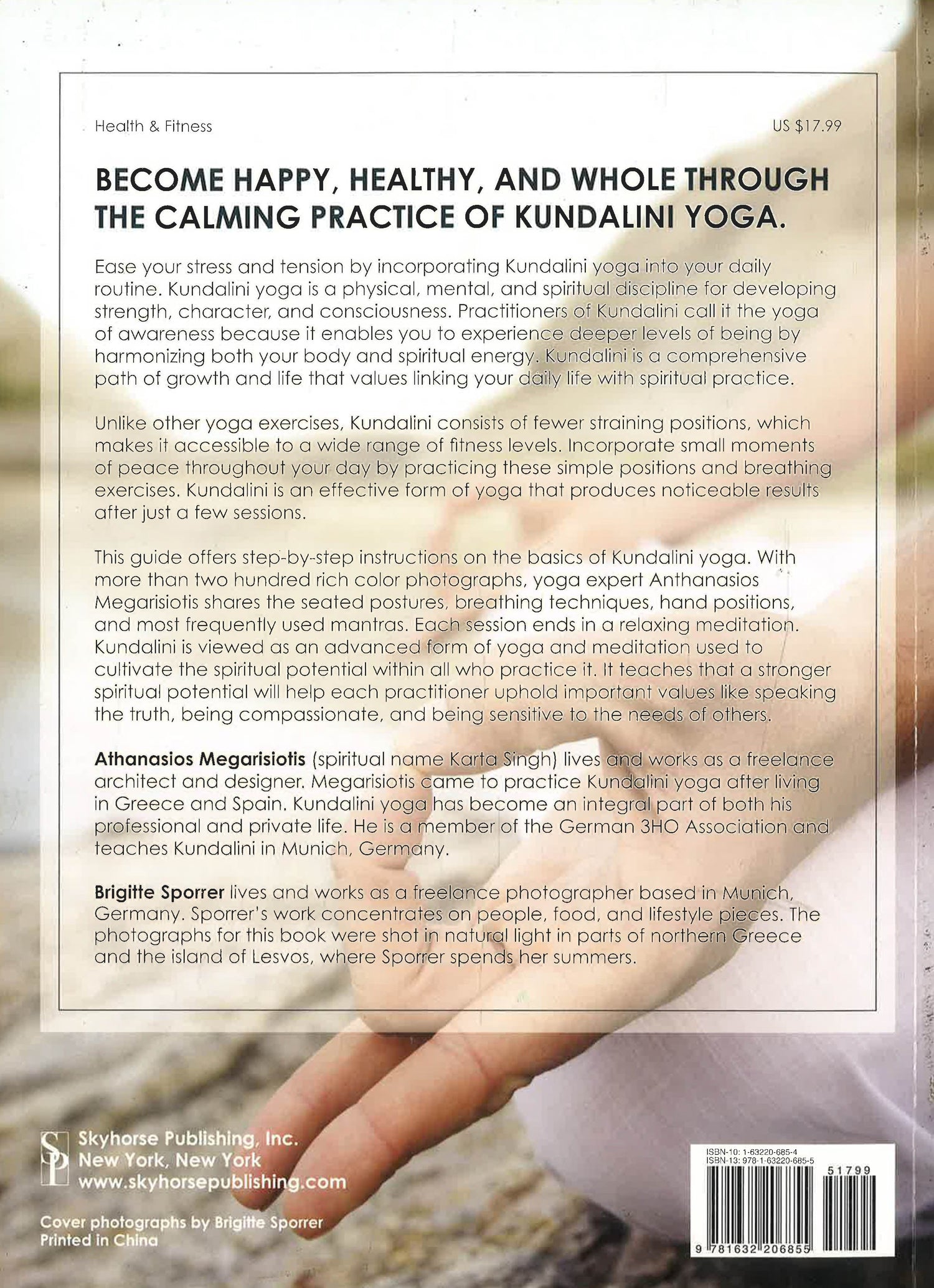 This guide offers step-by-step instructions on the basics of Kundalini yoga. With over 200 rich full-color photographs, yoga expert Athanasios Megarisiotis shares the seated postures, breathing techniques, hand positions, and most frequently used mantras. Kundalini is viewed as an advanced form of yoga and meditation that is used to cultivate the spiritual potential within all who practice it. It teaches that a stronger spiritual potential will help each practitioner uphold important values like speaking the truth, being compassionate, and being more aware of the needs of others.