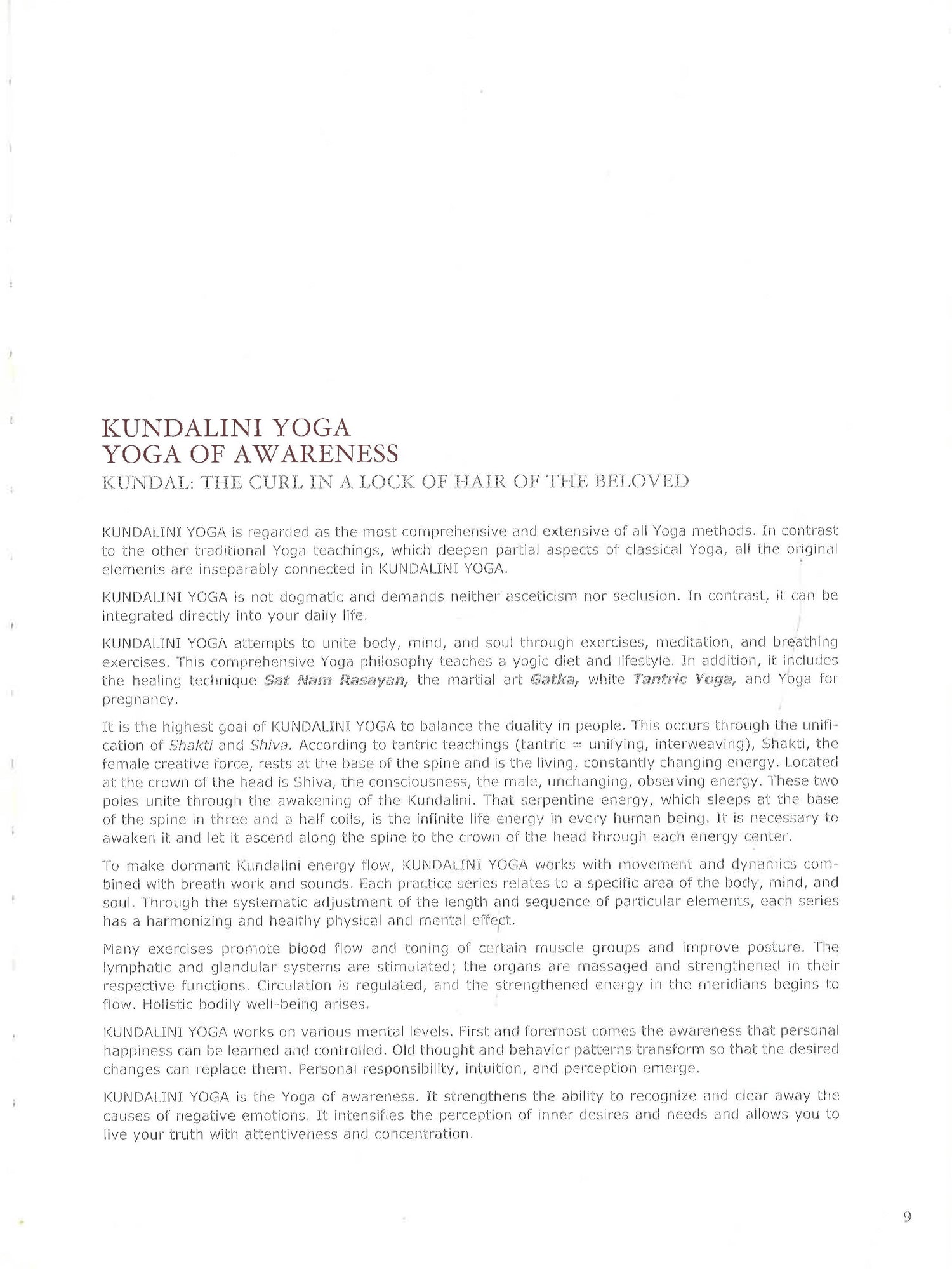 Ease your stress and tension by incorporating Kundalini yoga into your daily routine. Kundalini yoga is a physical, mental, and spiritual discipline for developing strength, character, and consciousness. Practitioners of Kundalini call it the yoga of awareness because it enables you to experience deeper levels of being by harmonizing both your body and spiritual energy.