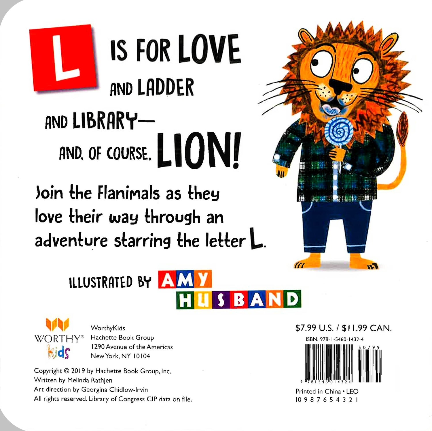 The Flanimals--a zany, flannel-clad group of animal friends--model positive behaviors in stories that will have little ones giggling and joining in to 'read' along. Each book focuses on a single letter of the alphabet and uses repetition and humor to explore concepts such as love, gratitude, and patience. In L Is for Love (and Lion!), Lion can't wait to show his friends how much he loves them. He leaps out to greet (and terrifies) Llama, shares his lunch, and 'rescues' Lemur from a tree. The friends' interactions are conveyed through simple text that builds upon itself with each new L word: 'L is for Love and Lunch and Ladder and Library.' Although initially startled by Lion's enthusiasm, the friends soon see his good intentions and respond with love. Children will enjoy predicting the repeating elements and recognizing the letter L as they learn about love with the adorably hip Flanimals.