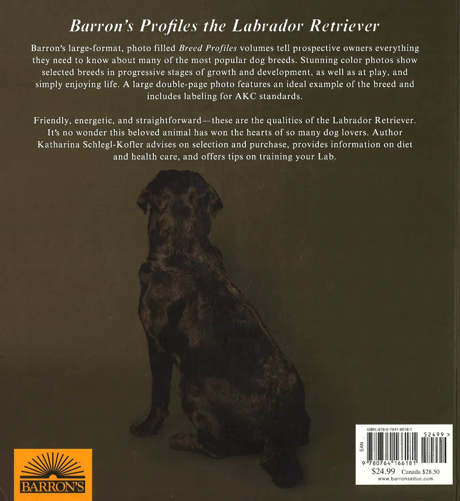 Dog lovers considering purchase of a Labrador Retriever puppy can open this handsome, large-format book and see vivid color photos of typical Labs in their progressive stages of growth and development. Each title in Barron's Breed Profiles tells prospective dog owners everything they need to know about a specific breed, and Labrador Retrievers profiles a breed of outstanding popularity worldwide. Here is the Lab's story in beautifully illustrated chapters that describe