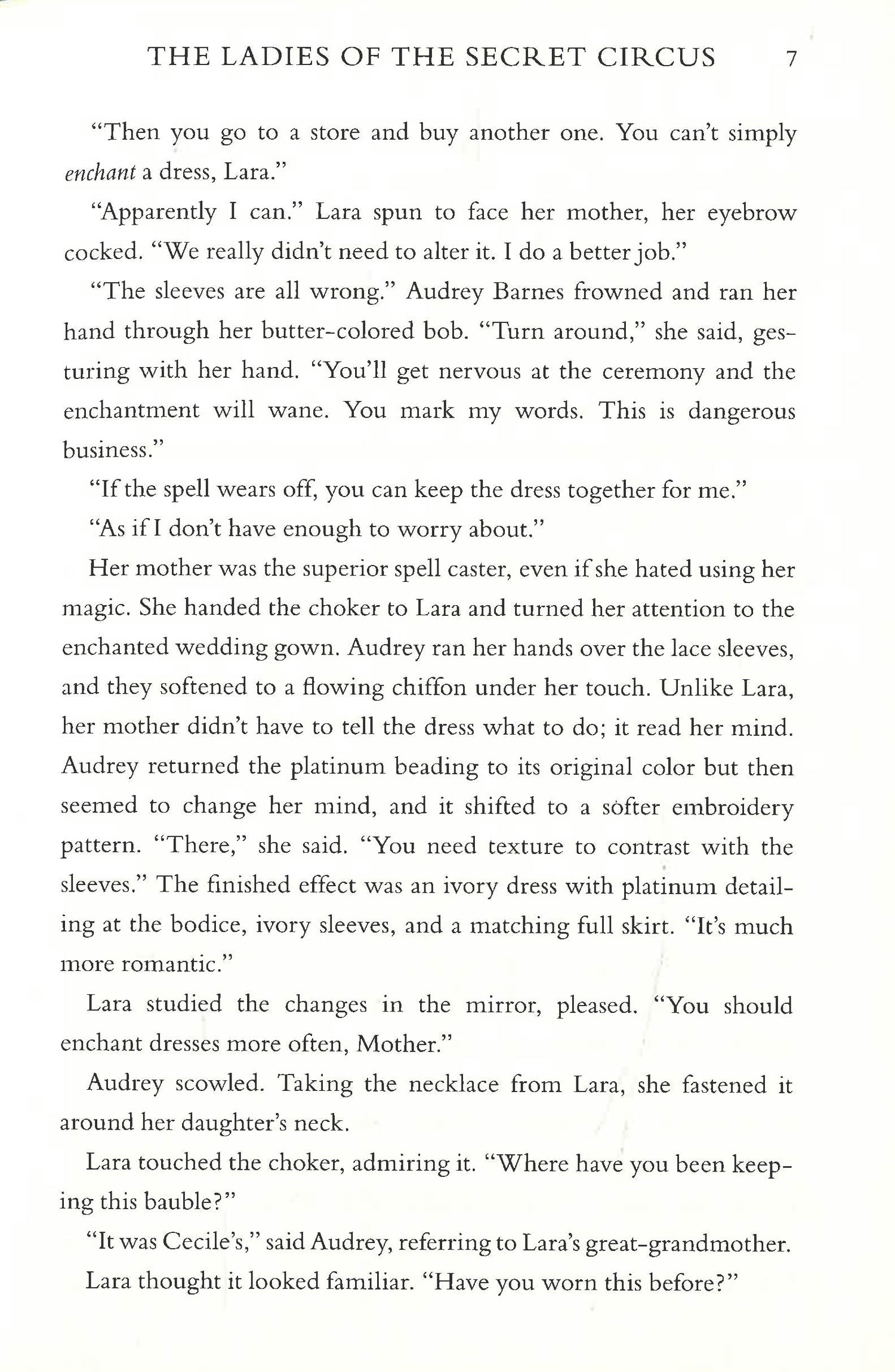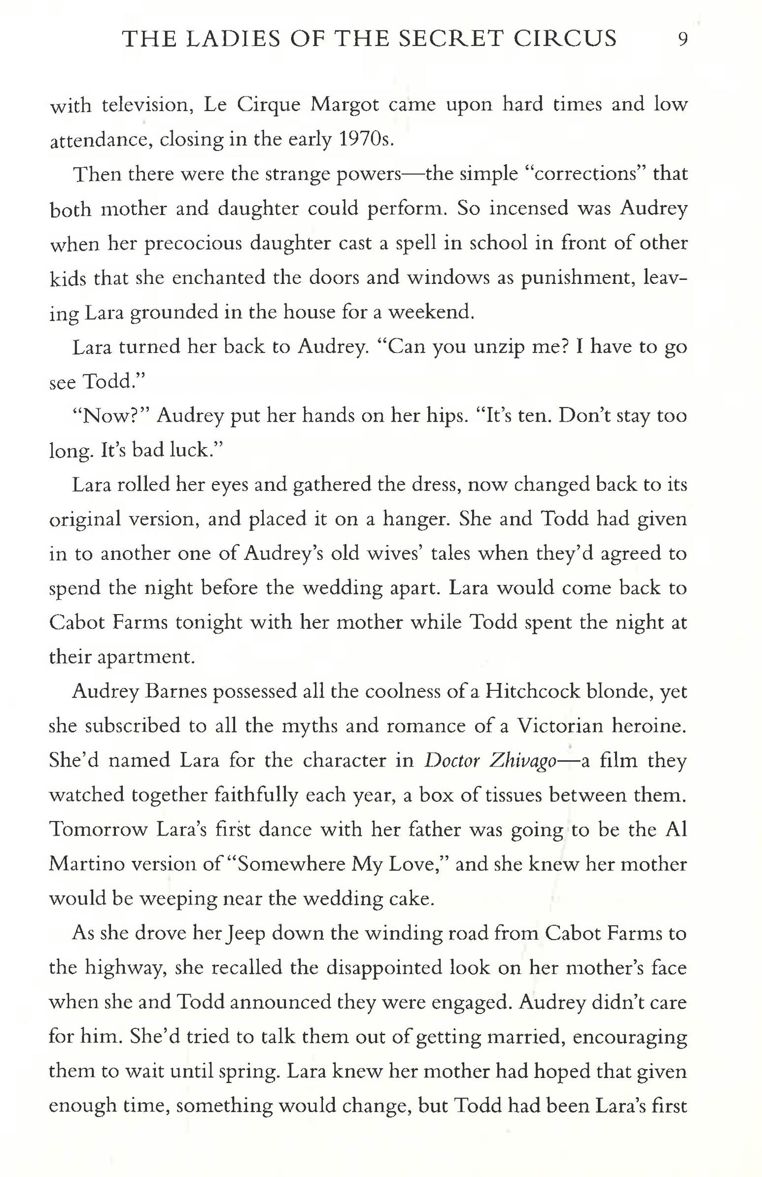 Virginia, 2004: Lara Barnes is on top of the world until her fiancé disappears on their wedding day. When her desperate search for answers unexpectedly leads to her great-grandmother's journals, Lara is swept into a story of a dark circus and ill-fated love.