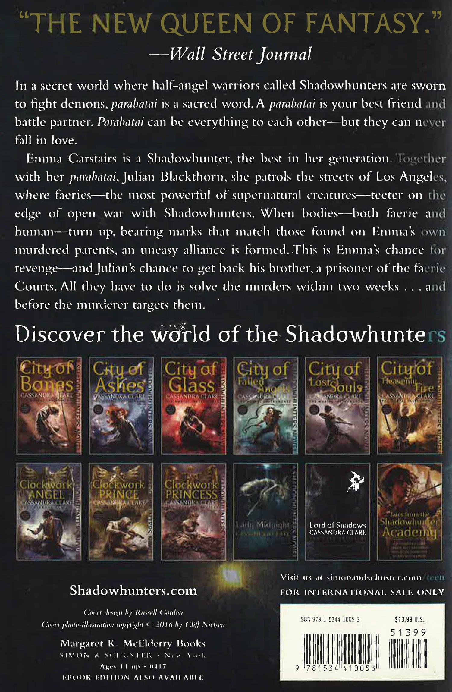 Together with her parabatai Julian Blackthorn, Emma must learn to trust her head and her heart as she investigates a demonic plot that stretches across Los Angeles, from the Sunset Strip to the enchanted sea that pounds the beaches of Santa Monica. If only her heart didn’t lead her in treacherous directions…