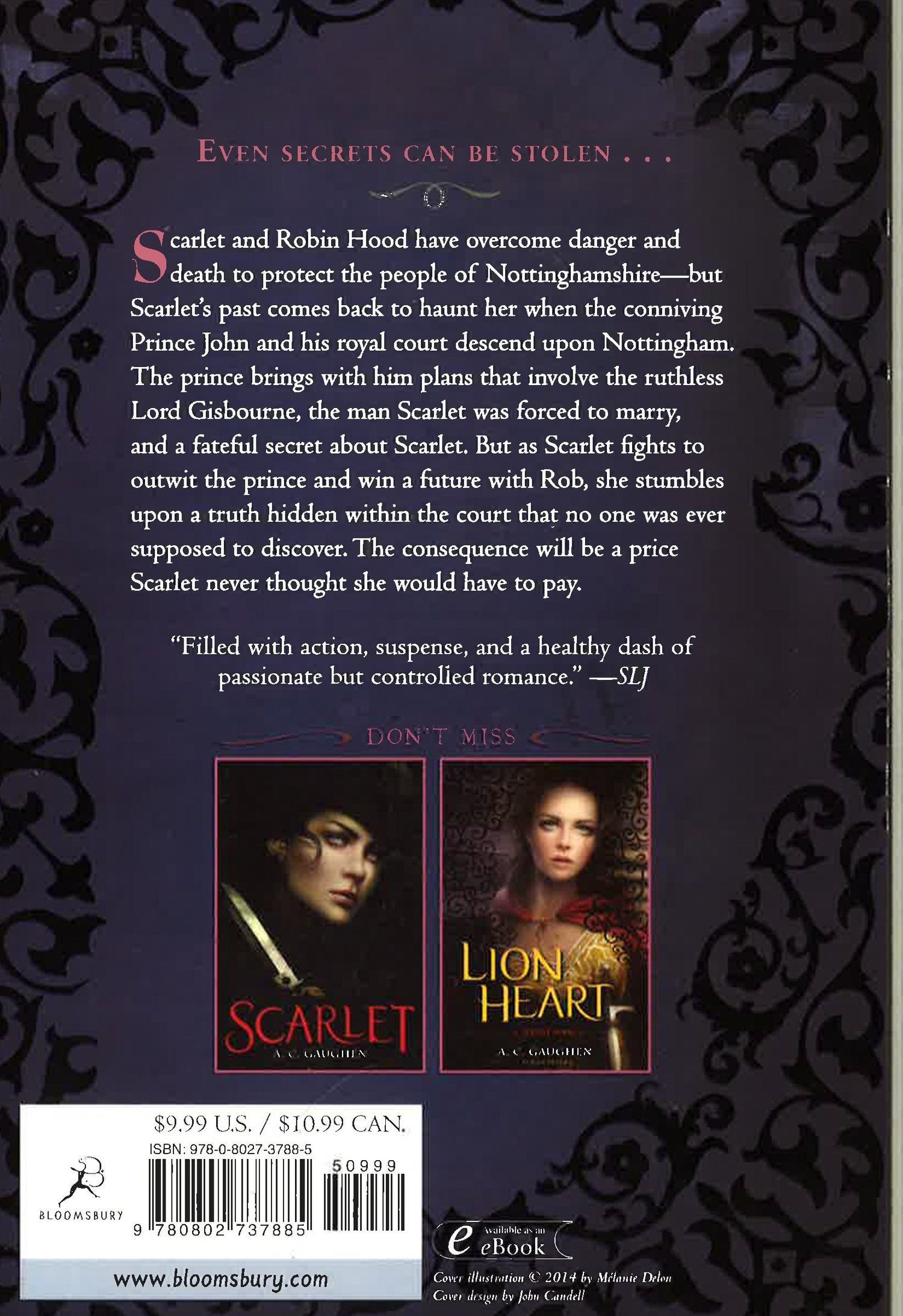 Scarlet's true identity has been revealed, but her future is uncertain. Her forced marriage to Lord Gisbourne threatens Robin and Scarlet's love, and the royal court has come to Nottingham to appoint a new sheriff. The people hope that Prince John will give them a champion, but the prince has different plans . . . involving Scarlet and Lord Gisbourne. Scarlet must put aside her weapons and boys' clothing to join the dark and plotting court. She will do anything to outwit the Prince and win a life with Rob, but hidden within the court is a secret no one was supposed to discover. When the truth is revealed, Scarlet will have to pay a steep price. Featuring a strong girl heroine who will appeal to fans of Grave Mercy and Throne of Glass, this sequel to Scarlet will leave readers breathless for more.