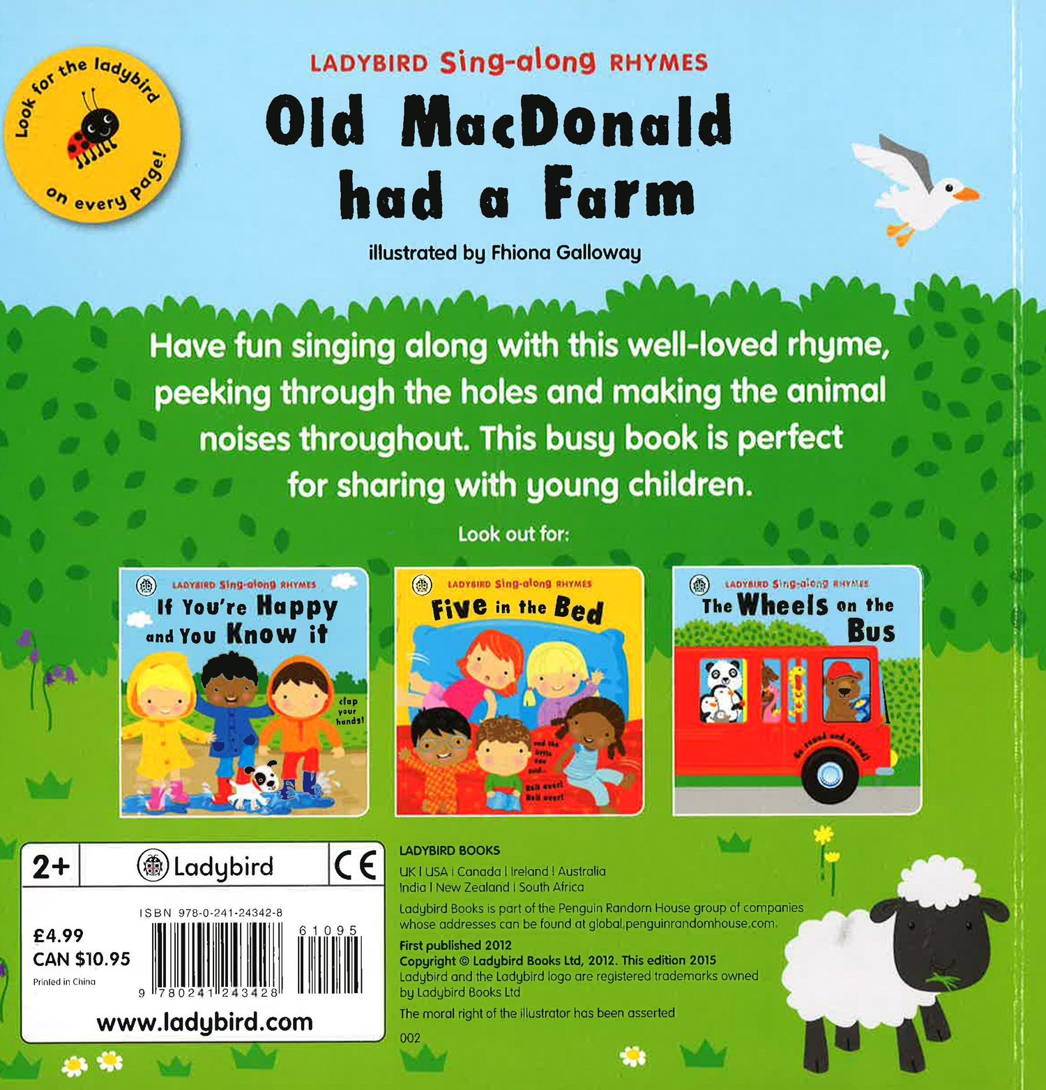 Old MacDonald had a farm, E-I-E-I-O!This sturdy singalong rhyme book from Ladybird is perfect for sharing with young children. There's a different farm animal verse from the classic rhyme 'Old MacDonald Had a Farm' to sing along to on each page plus fun peek-through holes for little fingers to explore. Bright, detailed illustrations are great for talking about and there's even a little ladybird to find on every page!