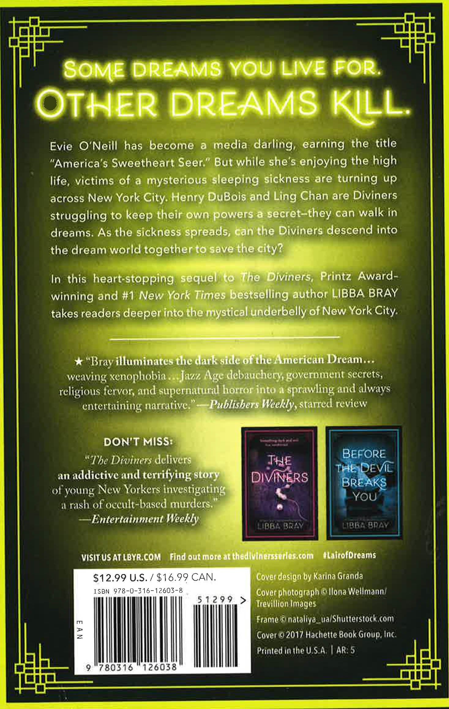 The thrilling supernatural sequel in The Diviners series by #1 New York Times bestselling author Libba Bray! The longing of dreams draws the dead, and this city holds many dreams. After a supernatural show down with a serial killer, Evie O'Neill has outed herself as a Diviner. With her uncanny ability to read people's secrets, she's become a media darling and earned the title "America's Sweetheart Seer." Everyone's in love with the city's newest It Girl... everyone except the other Diviners. Piano-playing Henry Dubois and Chinatown resident Ling Chan are two Diviners struggling to keep their powers a secret--for they can walk in dreams. And while Evie is living the high life, victims of a mysterious sleeping sickness are turning up across New York City. As Henry searches for a lost love and Ling strives to succeed in a world that shuns her, a malevolent force infects their dreams. And at the edges of it all lurks a man in a stovepipe hat who has plans that extend farther than anyone can guess... As the sickness spreads, can the Diviners descend into the dreamworld to save the city? In this heart-stopping sequel to The Diviners, Printz award-winning and New York Times bes