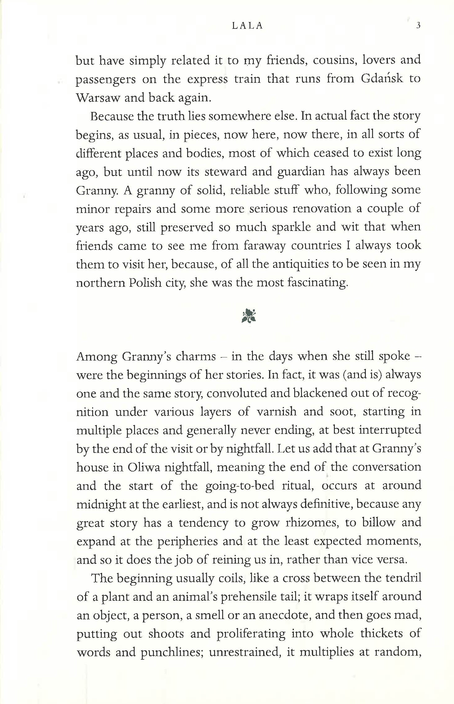 Lala has lived a dazzling life. Born in Poland just after the First World War and brought up to be a perfect example of her class and generation – tolerant, selfless and brave – Lala is an independent woman who has survived some of the most turbulent events of her times. As she senses the first signs of dementia, she battles to keep her memories alive through her stories, telling her grandson tales of a life filled with love, faithlessness and extraordinary acts of courage.