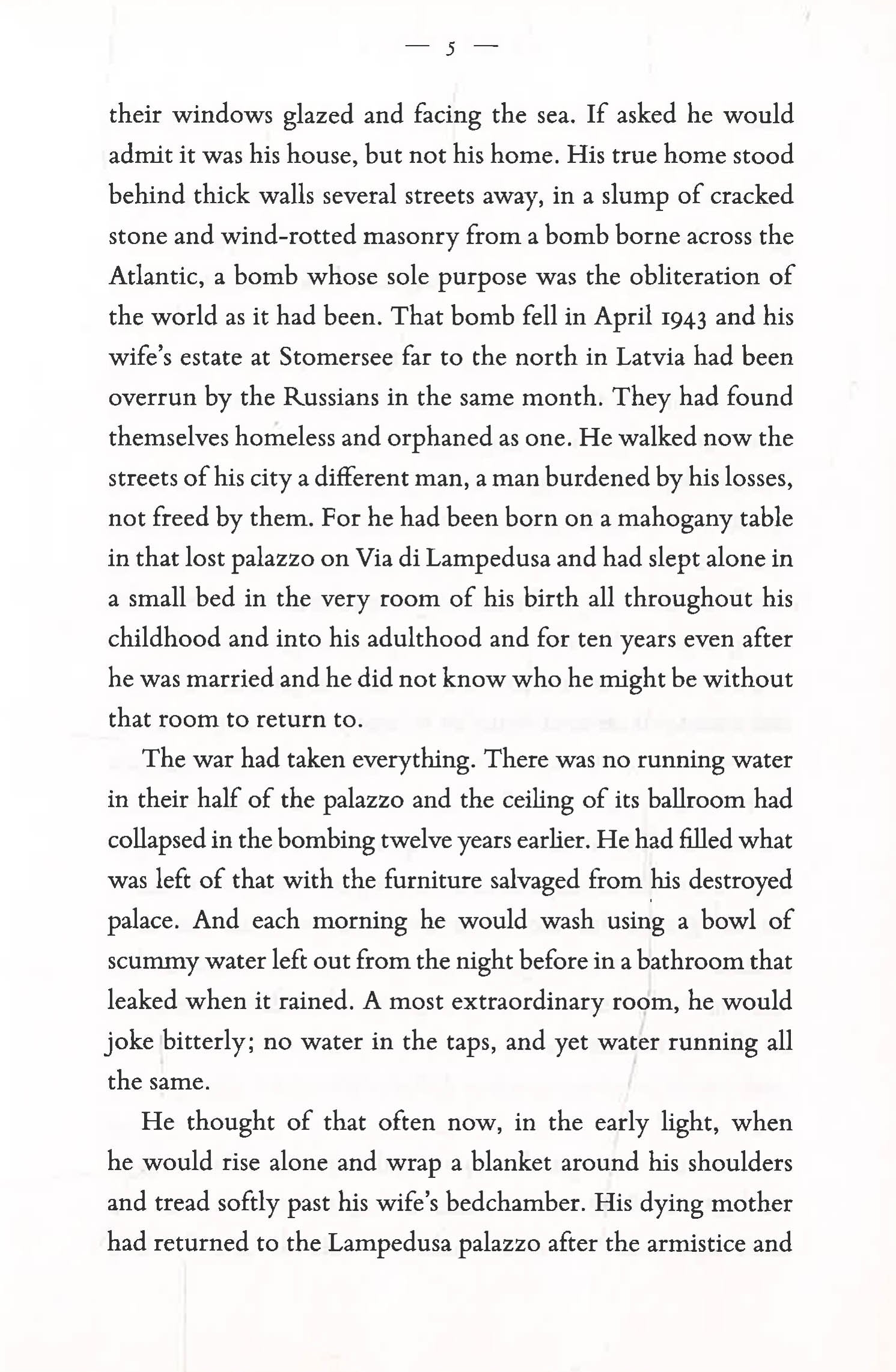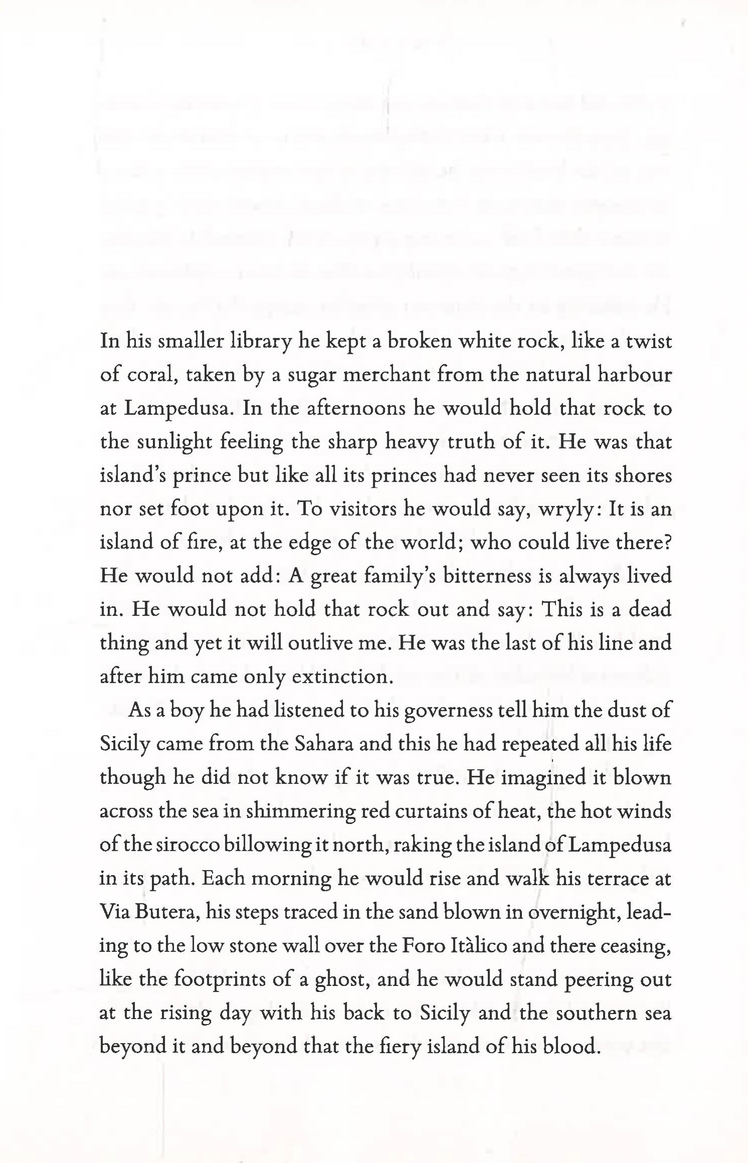 In sun-drenched Sicily, among the decadent Italian aristocracy of the late 1950s, Giuseppe Tomasi, the last prince of Lampedusa, struggles to complete the novel that will be his lasting legacy, The Leopard. With a firm devotion to the historical record, Lampedusa leaps effortlessly into the mind of the writer and inhabits the complicated heart of a man facing down the end of his life, struggling to make something of lasting worth, while there is still time.