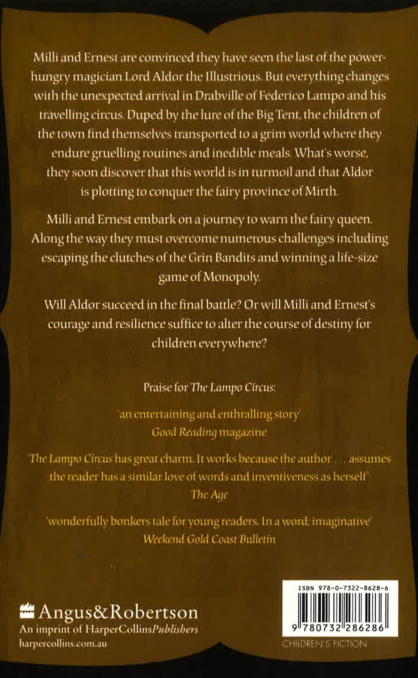 Milli and Ernest are convinced they have seen the last of the power-hungry magician Lord Aldor the Illustrious. But everything changes with the unexpected arrival in Drabville of Federico Lampo and his travelling circus. Duped by the lure of the Big tent, the children of the town find themselves transported to a grim world where they endure gruelling routines and inedible meals. What's worse, they soon discover that this world is in turmoil and that Aldor is plotting to conquer the fairy province of Mirth. Milli and Ernest embark on a journey to warn the fairy queen. Along the way they must overcome numerous challenges including escaping the clutches of the Grin Bandits and winning a life-size game of Monopoly. Will Aldor succeed in the final battle? Or will Milli and Ernest's courage and resilience suffice to alter the course of destiny for children everywhere? Praise for the Lampo Circus:'an entertaining and enthralling story'Good Reading magazine 'the Lampo Circus has great charm. It works because the author ... assumes the reader has a similar love of words and inventiveness as herself'the Age 'wonderfully bonkers tale for young readers.