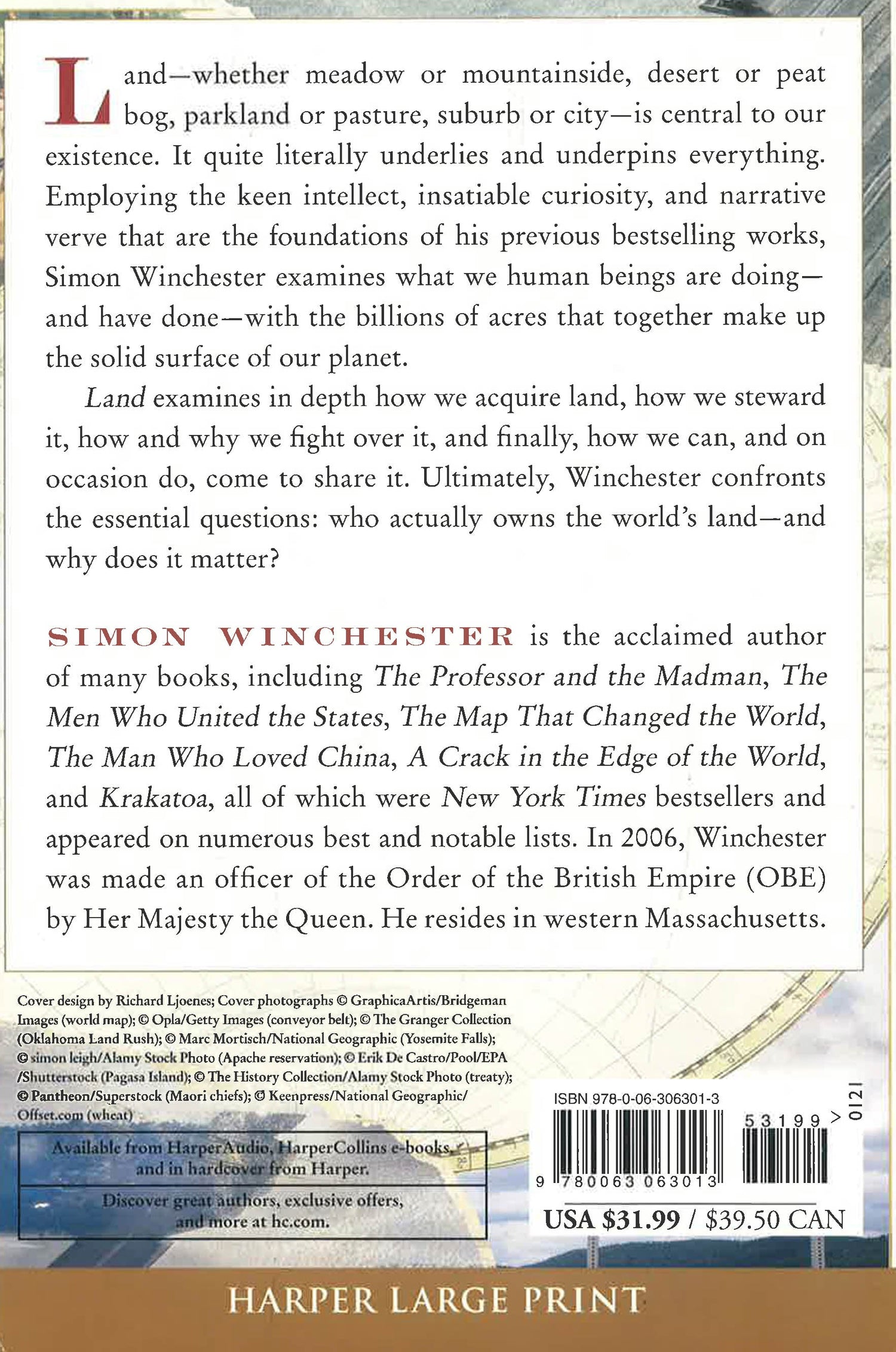Land—whether meadow or mountainside, desert or peat bog, parkland or pasture, suburb or city—is central to our existence. It quite literally underlies and underpins everything. Employing the keen intellect, insatiable curiosity, and narrative verve that are the foundations of his previous bestselling works, Simon Winchester examines what we human beings are doing—and have done—with the billions of acres that together make up the solid surface of our planet.