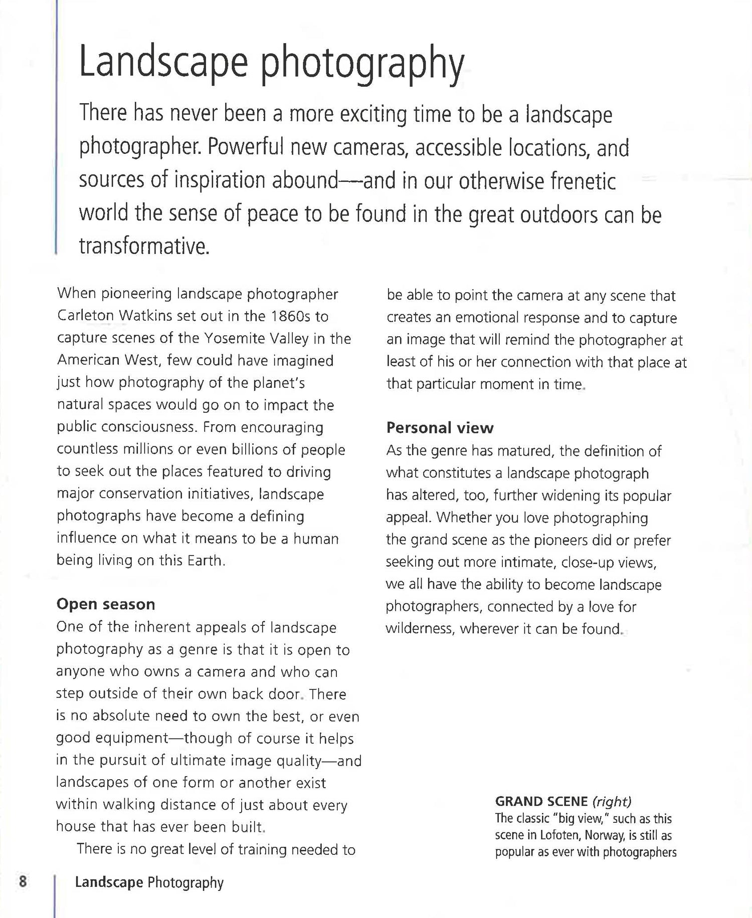 This title is aimed at both the novice and more experienced amateur, with hints & tips from professional photographers. This new series of "Expanded Guides" focuses on photographic techniques not only to give you a comprehensive grounding in the subject but also takes you a step further to enable you to get much more from your photography. "Landscape Photography" is a detailed guide to capturing outstanding images in the great outdoors, using today's sophisticated digital SLR and compact digital cameras. From choosing the correct camera, lenses and filters to the practicalities of gauging the weather, tide times and the optimum time of day to shoot, this comprehensive handbook discusses the theory and technicalities of exposure, composition, light and colour. Expert advice describes the preparation and techniques for shooting in a wide variety of outdoor locations, from mountains, coastlines, deserts and jungles, to lakes, waterfalls, rivers, clouds, flowers and trees - plus how to successfully photograph people and animals in the landscape.