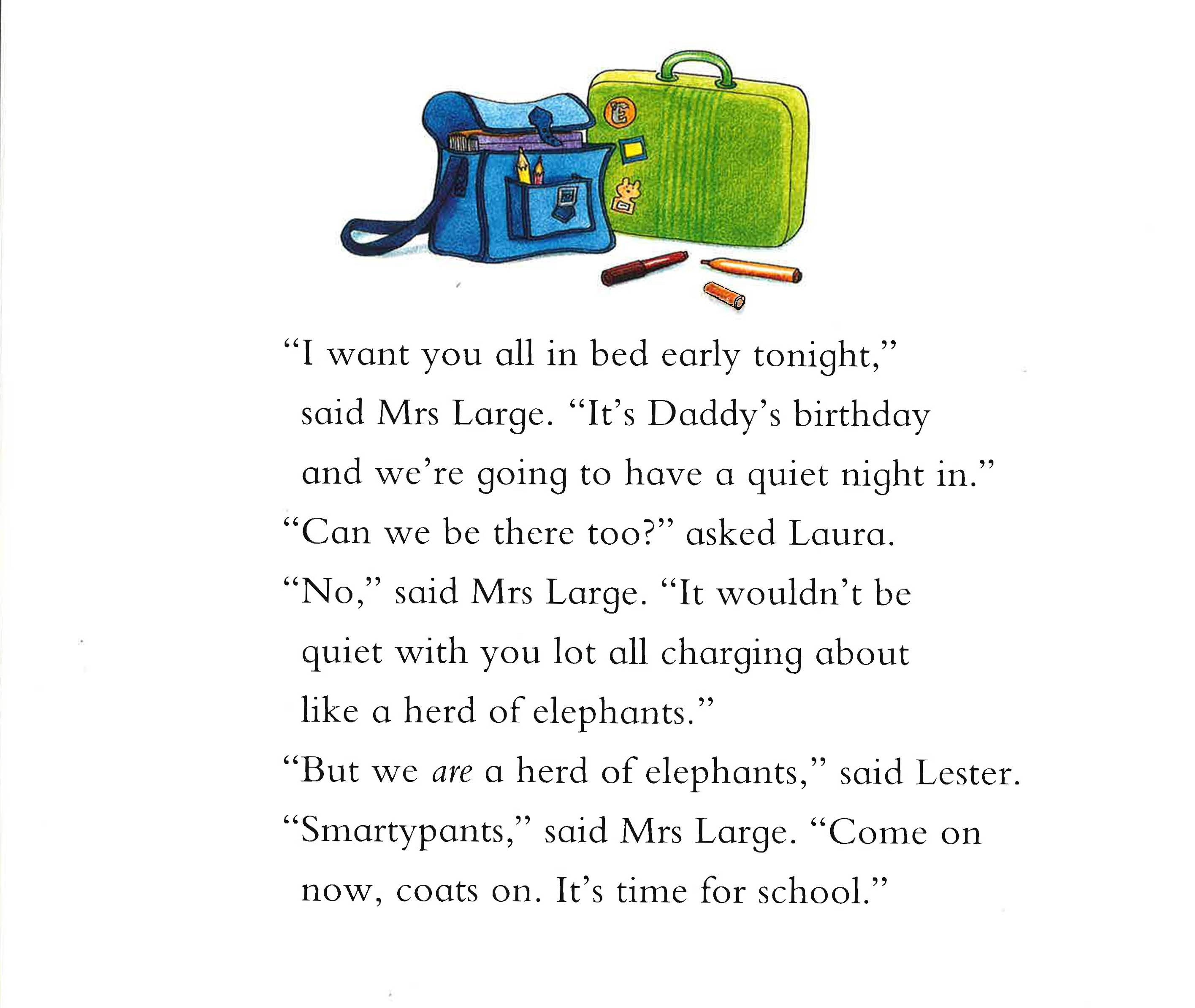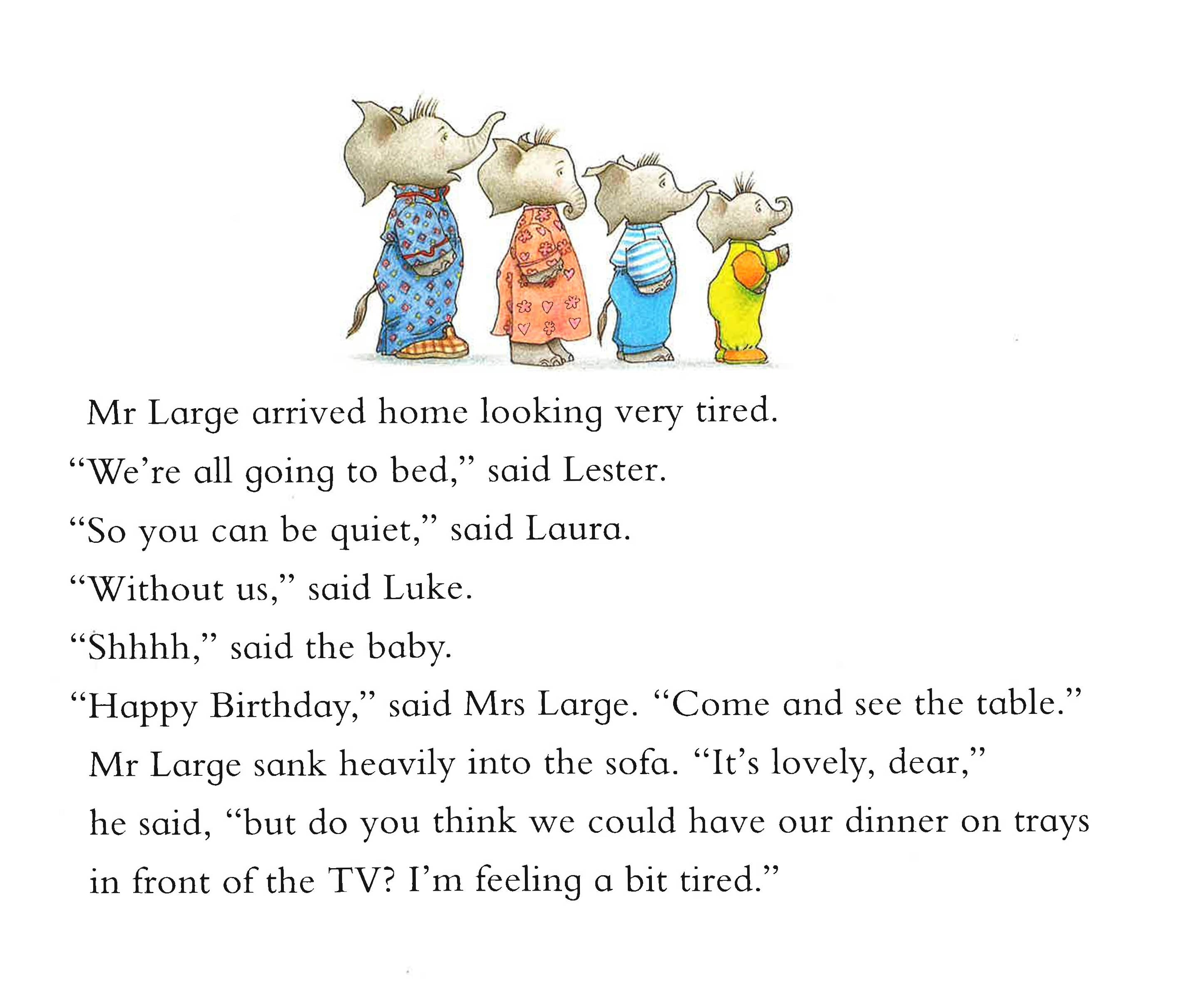 It's Mr Large's birthday and Mrs Large has prepared him a meal, as they're going to celebrate with a quiet night in. But as usual in the Large household, things don't go to plan, and Mr and Mrs Large fall asleep on the sofa! So the little Larges sneak off to bed with all the lovingly prepared food...