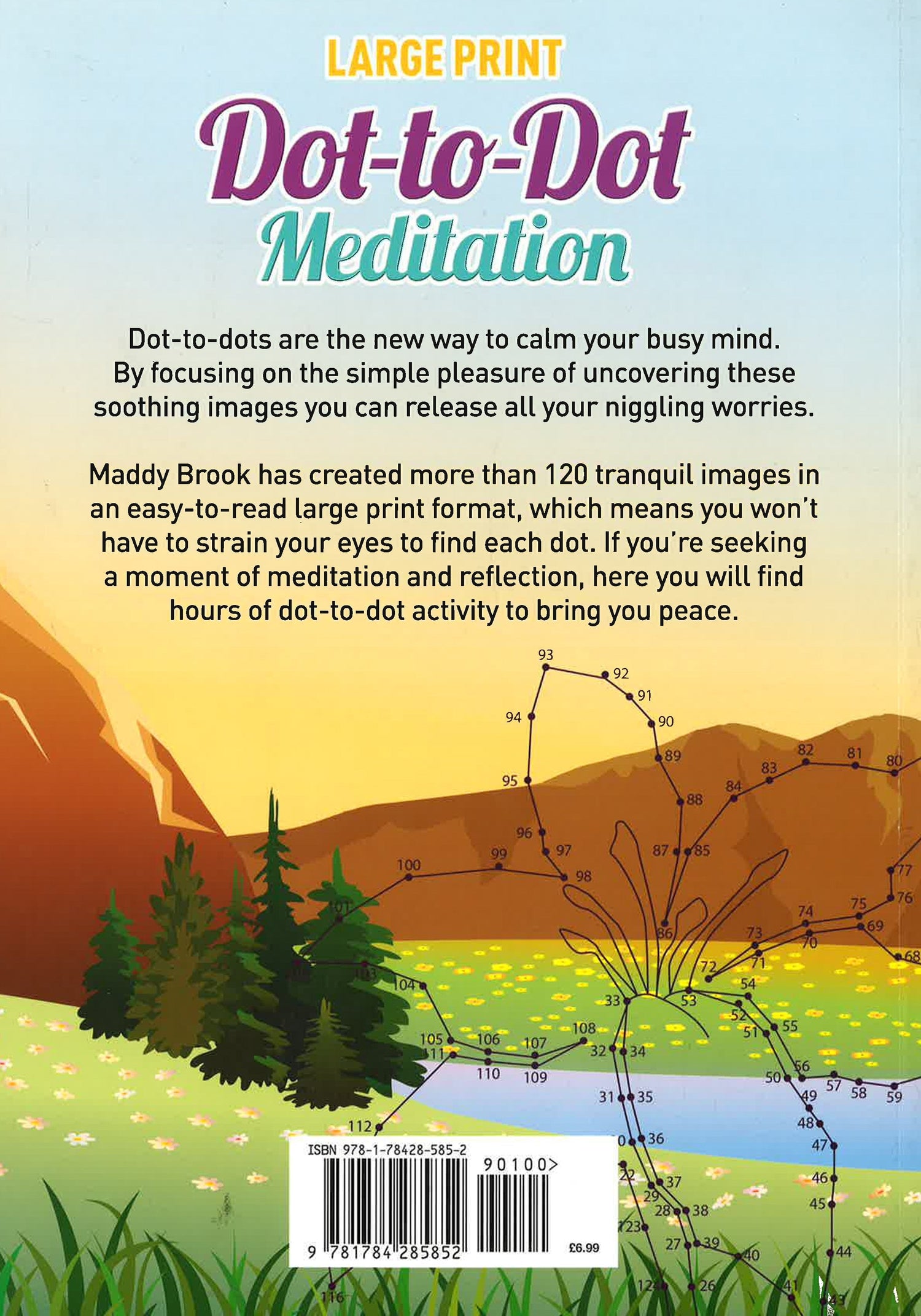 Dot-to-dots are the new way to calm your busy mind. By focusing on the simple pleasure of uncovering these soothing images you can release all your niggling worries. Maddy Brook has created more than 120 tranquil images in an easy-to-read large print format, which means you won't have to strain your eyes to find each dot. If you're seeking a moment of meditation and reflection, here you will find hours of dot-to-dot activity to bring you peace.