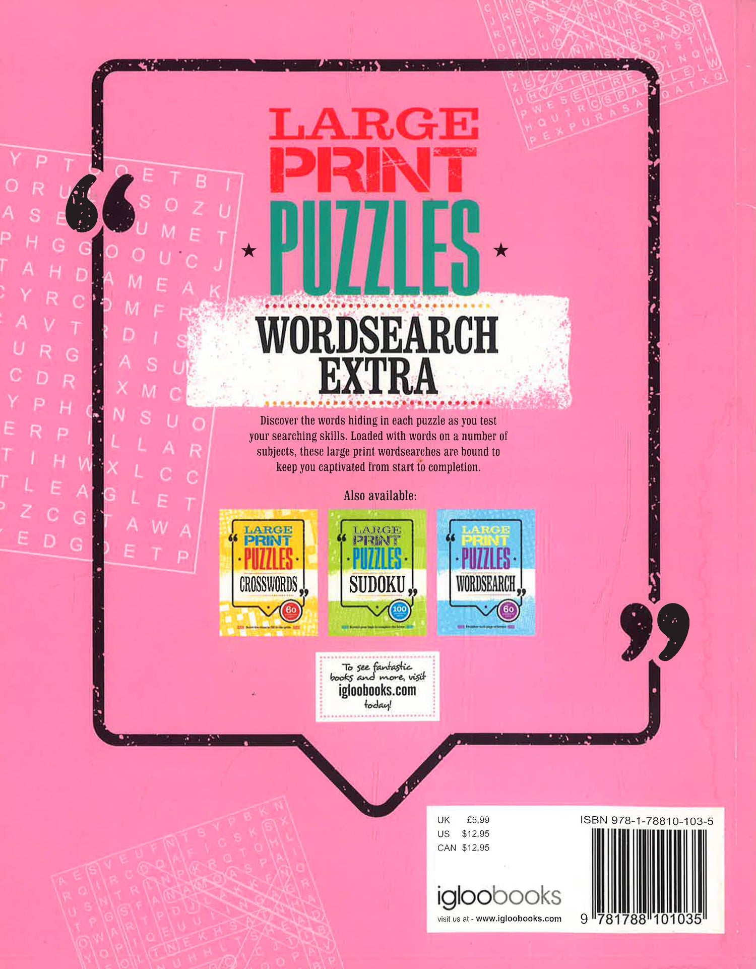 Discover the words hiding in each puzzle as you test your searching skills. Loaded with words on a number of subjects, these large print wordsearches are bound to keep you captivated from start to completion.