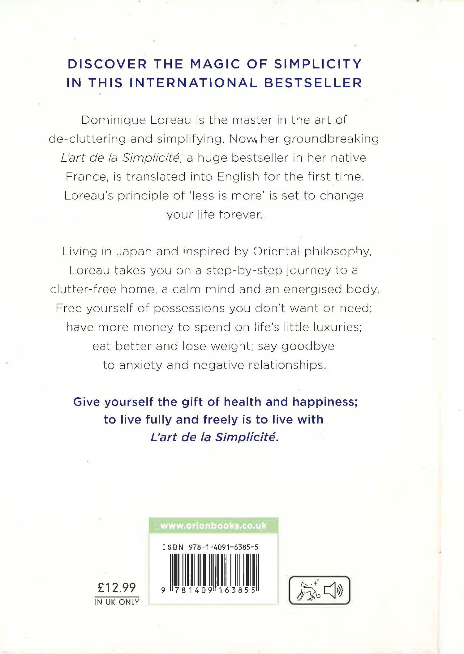 Having lived in Japan for many years and inspired by oriental philosophy, Dominique Loreau discovered the beauty of a life well lived through the art of simplicity. Her lifestyle rests on the principle of 'less is more', and imbues all areas of existence, from the material to the spiritual. She captured her philosophy in the ground-breaking L'art de la Simplicite, which was an massive bestseller in her native France and is now available in the English language for the first time.