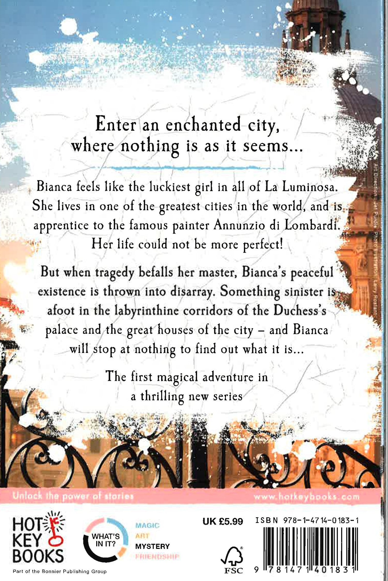 A thrilling magical mystery set in a re-imagined Renaissance Venice Twelve-year-old Bianca feels like the luckiest girl in Venice. She's apprenticed to the most famous painter in the world - Annunzio di Lombardi - and she's learning all the tricks of the trade in the most glamorous and powerful place in the city: the Duchess's Palace. But one night disaster strikes. Bianca's beloved Lombardi is given a poisoned cup of wine at a party, and collapses - but not before giving Bianca a magical paintbrush, which allows her to travel through hidden doorways throughout the city. Bianca will have to use all of her pluck, courage and cunning to find out who tried to hurt her master - and to discover what is wrong with the Duchess, who is behaving very strangely indeed... THE LAST APPRENTICE is a delightful and exciting mystery perfect for middle-grade readers looking for feisty heroines, sinister baddies and a good dash of magic and suspense.