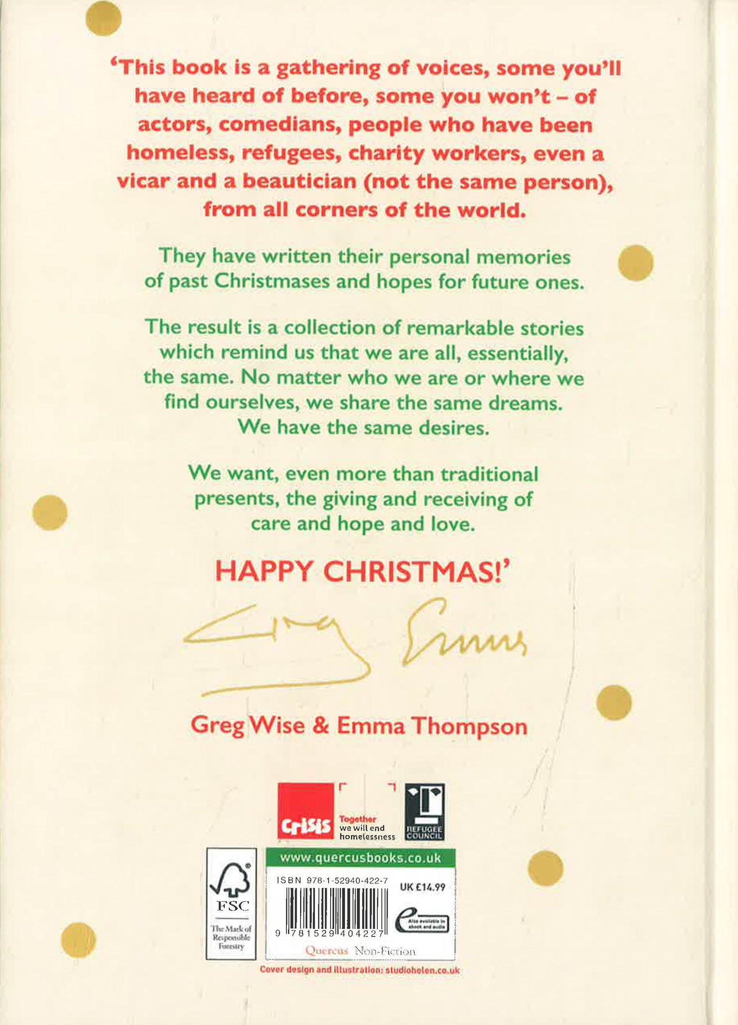 The perfect gift for anyone who loves all things Christmas ... it's a festive gem' Woman & Home'A beautiful, funny and soulful collection of personal essays' Prima___________The perfect gift book, featuring the writing of Meryl Streep, Bill Bailey, Emilia Clarke, Olivia Colman, Caitlin Moran, Richard Ayoade, Emily Watson and others, to coincide with the upcoming movie Last Christmas, starring Emma Thompson, Emilia Clarke and Henry Golding.When you think back to Christmases past, what (if anything) made it magical? Looking towards the future, what would your perfect Christmas be? What would you change? What should we all change?This is a beautiful, funny and soulful collection of personal essays about the meaning of Christmas, written by a unique plethora of voices from the boulevards of Hollywood to the soup kitchens of Covent Garden.Away from the John Lewis advert, the high street decorations and the candied orange in Heston Blumenthal's Christmas pudding, this gem of a book introduced and curated by Emma Thompson and Greg Wise celebrates the importance of kindness and generosity, acceptance and tolerance - and shows us that these values are not just for Christmas.