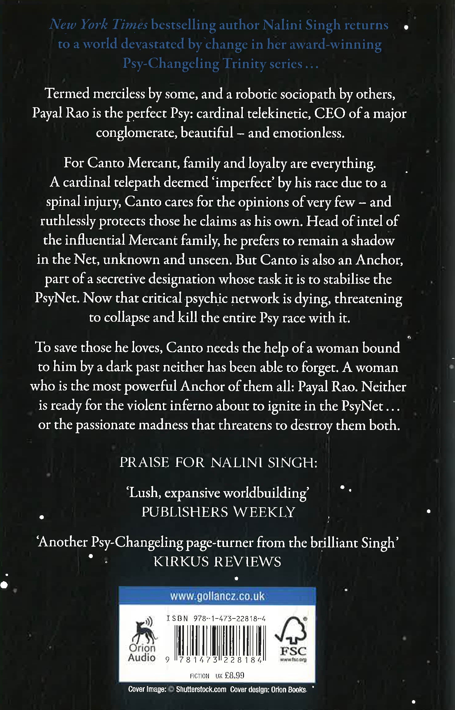 For Canto Mercant, family and loyalty are everything. A cardinal telepath deemed 'imperfect' by his race due to a spinal injury, Canto cares for the opinions of very few - and ruthlessly protects those he claims as his own. Head of intel of the influential Mercant family, he prefers to remain a shadow in the Net, unknown and unseen. But Canto is also an Anchor, part of a secretive designation whose task it is to stabilise the PsyNet. Now that critical psychic network is dying, threatening to collapse and kill the entire Psy race with it.