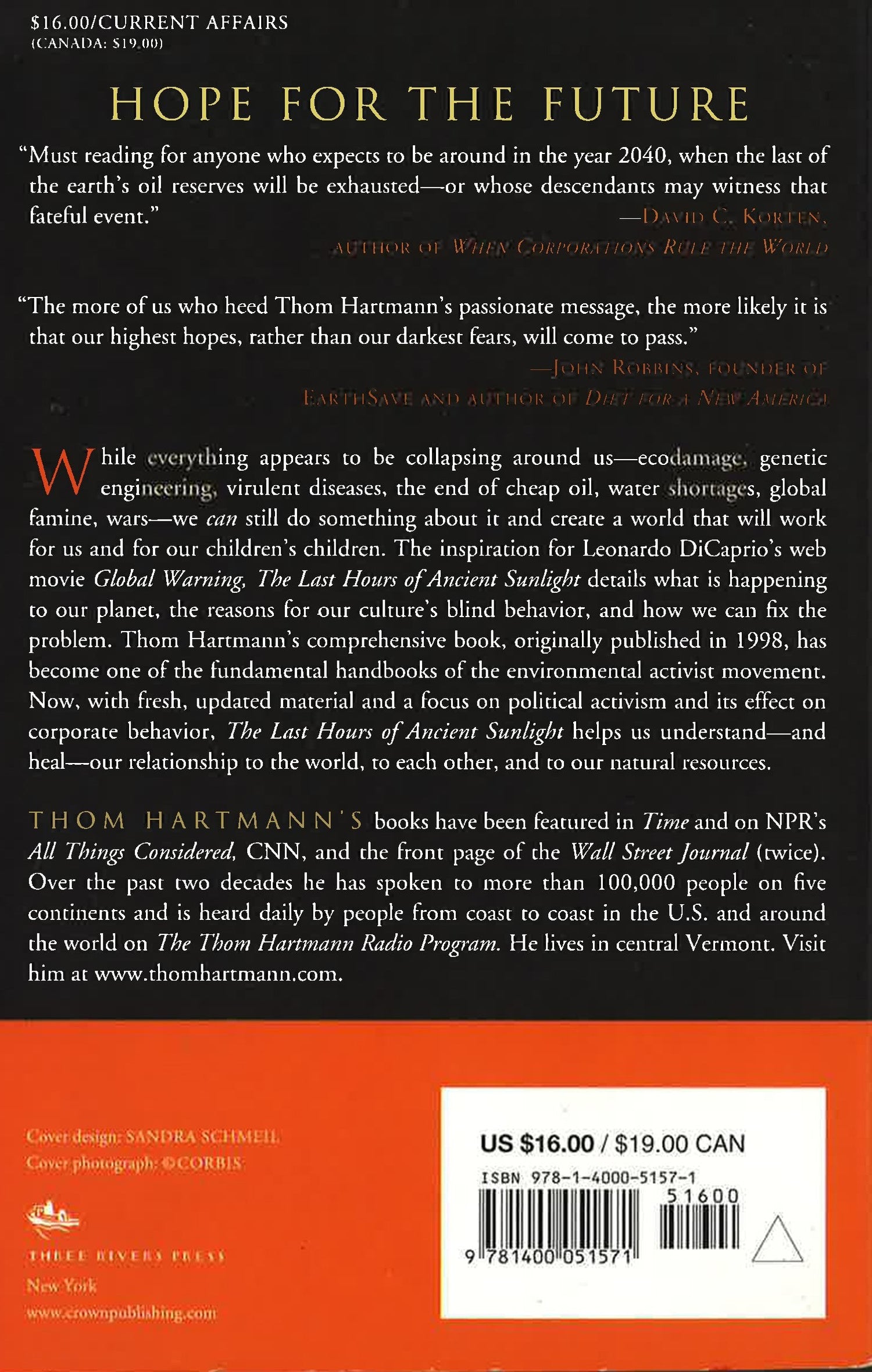 While everything appears to be collapsing around us - ecodamage, genetic engineering, virulent diseases, the end of cheap oil, water shortages, global famine, wars - we can still do something about it and create a world that will work for us and for our children's children. The inspiration for Leonardo DiCaprio's feature documentary movie The Eleventh Hour and soon to be released HBO special Ice on Fire, Last Hours of Ancient Sunlight details what is happening to our planet, the reasons for our culture's blind behavior, and how we can fix the problem. Thom Hartmann's comprehensive book is one of the fundamental handbooks of the environmental activist movement. Now with fresh, updated material on our Earth's rapid climate change and a focus on political activism and its effect on corporate behavior, The Last Hours of Ancient Sunlight helps us understand - and heal - our relationship to the world, to each other, and to our natural resources.
