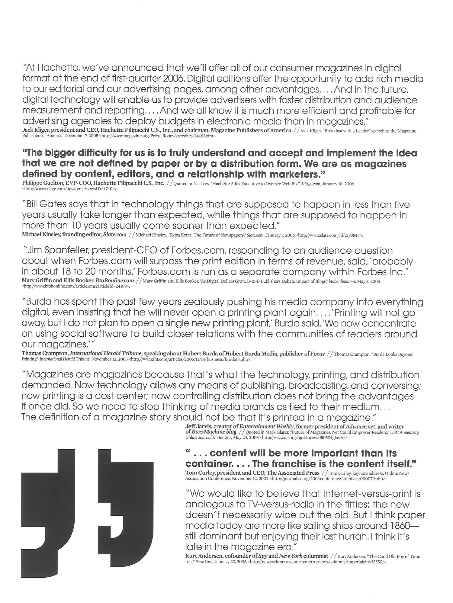 Presented here in this visual anthology are the current boutique periodicals so cutting-edge, they will continue to flourish in print even as their mainstream contemporaries move to digital. Selected from more than 20 countries are preeminent covers and layouts from over 150 independent magazines that advance the medium through their presentation ("Gum," "Kilimanjaro"), content ("Re," "Richardson"), design ("Uovo," "Werk"), and tailoring to a niche market ("Fantastic Man," "Me"). Featuring essays from top industry thinkers such as Steven Heller ("New York Times Book Review"), Terry Jones ("ID"), and Robert Sacks ("High Times," Time Inc.), this will be the sourcebook for magazine aficionados and professionals. "The Last Magazine" is published in association with the traveling exhibition, Magazines in Transition, which opens in New York in September, 2006 and travels to museums and galleries in ten cities worldwide including Barcelona, Paris, Luxembourg, Tokyo and Hong Kong.
