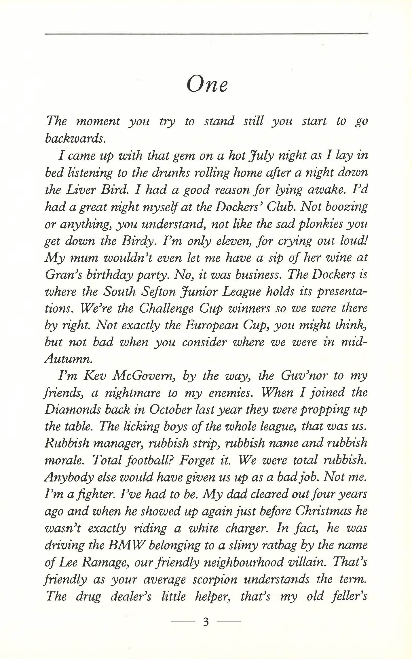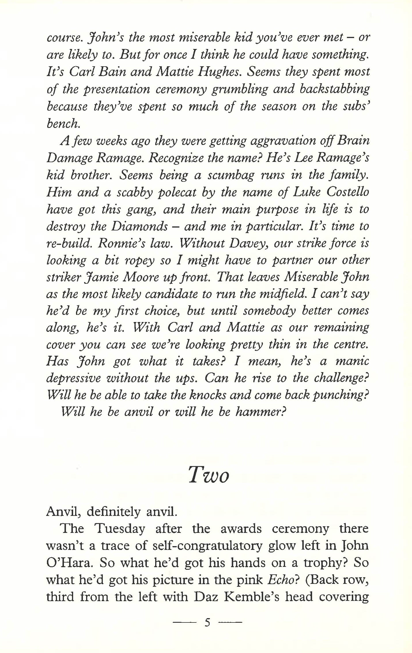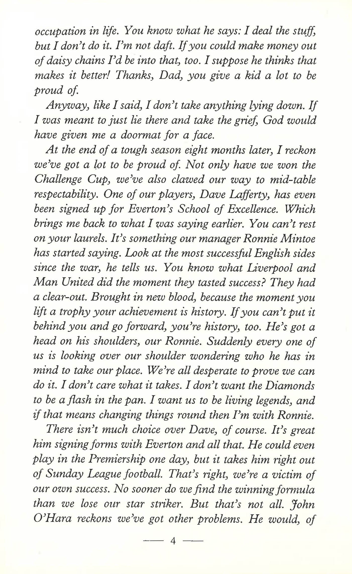The Rough Diamonds are a close knit team. Kev McGovern, their captain, makes sure they work hard and play hard. Right now, John O'Hara feels he's on the verge of losing everything. His family is about to break up. He's dumbstruck when he finds out that his Mum is seeing his teacher, and Dad...well the less said the better. John feels lonely and insecure; none of this is helping his street cred with the lads, and worse still his form on the pitch is really suffering.