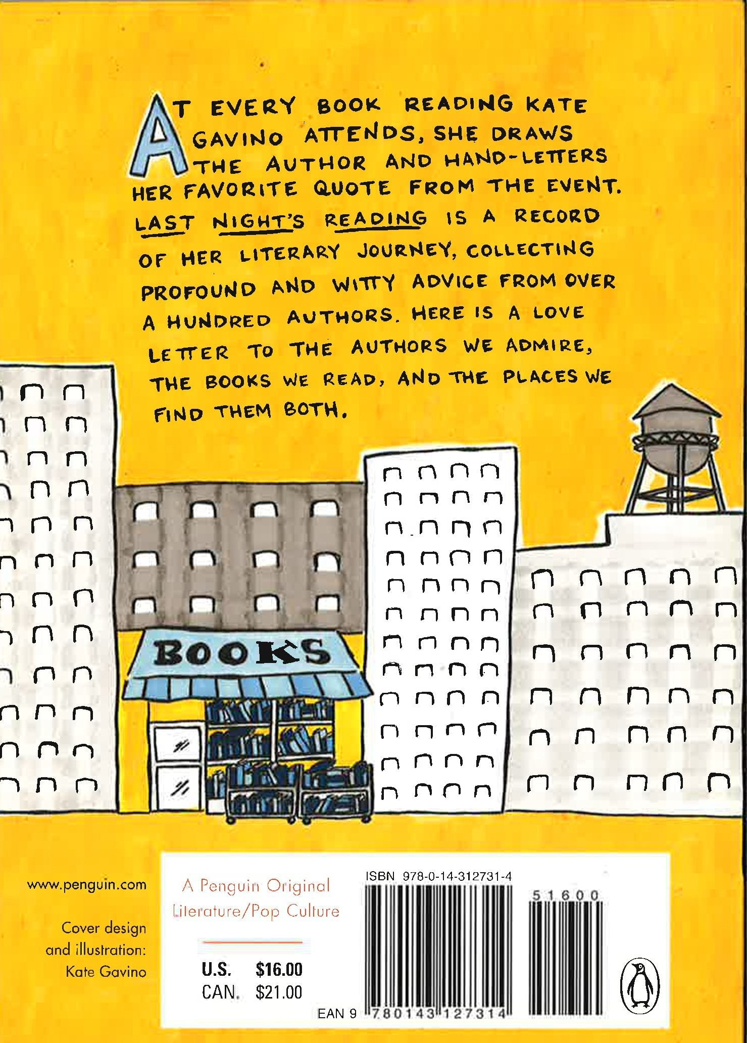 Why do we go to book readings? For a chance to see the authors we love come to life off the page, answering our questions and proving to be the brilliant, witty people we catch glimpses of through their work. Illustrator Kate Gavino (author of Sanpaku) captures the wonder of this experience firsthand. At every reading she attends, Kate hand-letters the event's most memorable quote alongside a charming portrait of the author. In Last Night's Reading, Kate takes us on her journey through the literary world, sharing illustrated insight from more than one hundred of today's greatest writers--including Zadie Smith, Junot Diaz, Lev Grossman, Elizabeth Gilbert, and many more--on topics ranging from friendship and humor to creativity and identity. A celebration of authors, reading, and bookstores, this delightful collection is an advice book like no other and a love letter to the joy of seeing your favorite author up close and personal. "Instead of putting together a lengthy play-by-play of the event she witnessed, Gavino records the best quote, and accompanies it with a colorful sketch of the author. It sounds simple, but the results are striking and unforgettable." -Flavorwire "A witty love letter to the literary world." -The Boston Globe