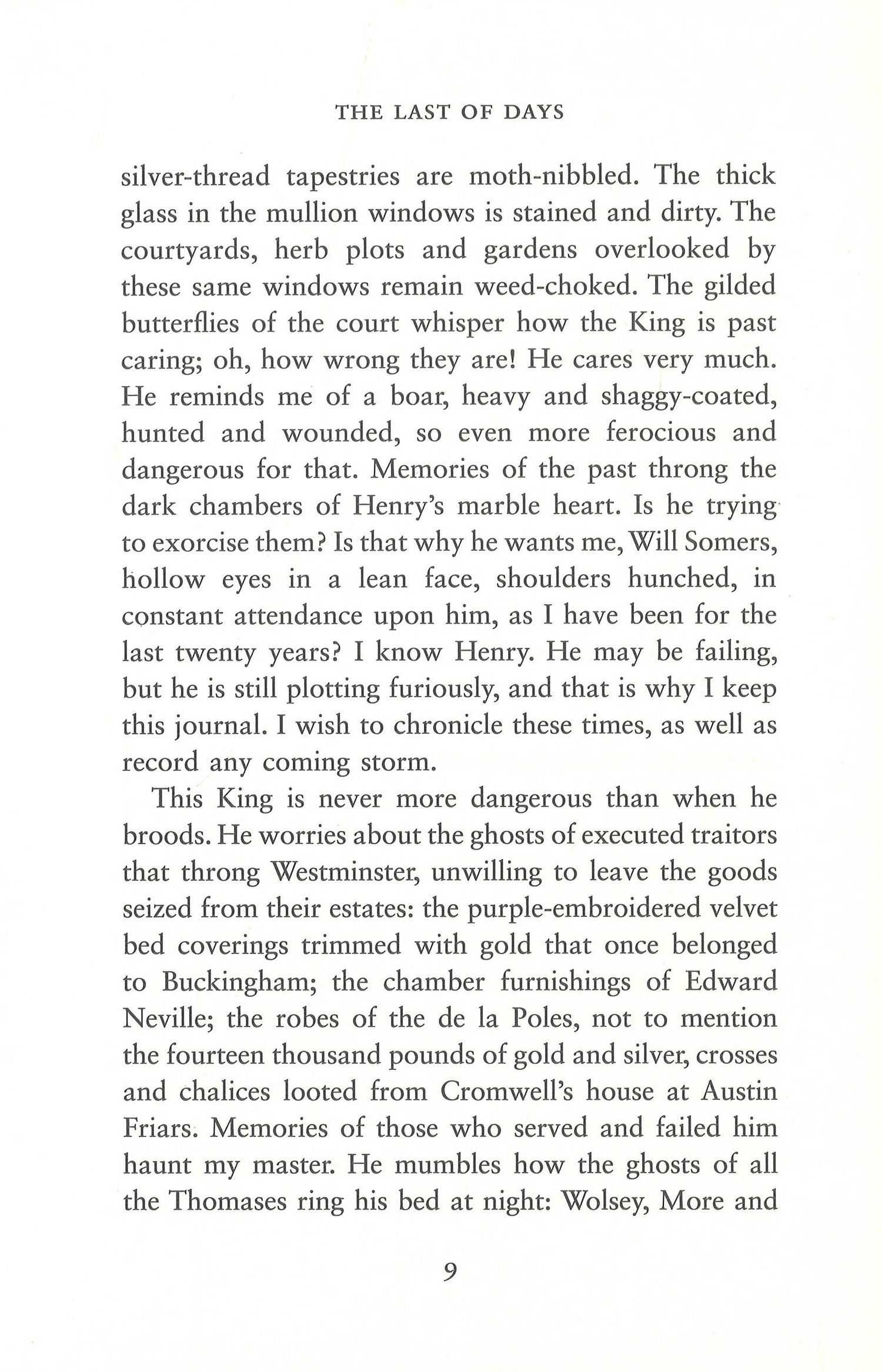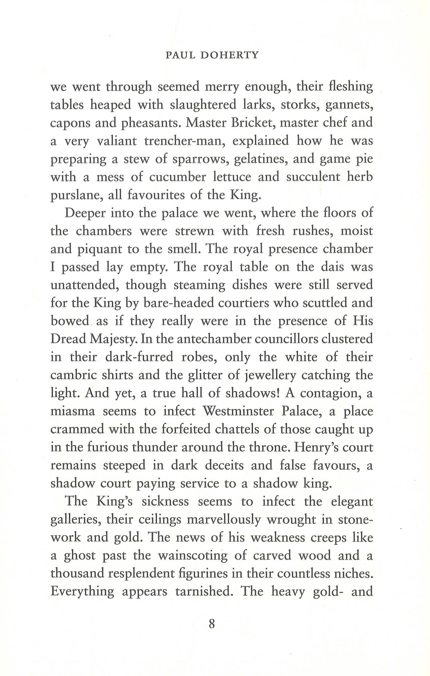In the final days of Henry VIII, one man is there to witness the demise of a legend... King Henry VIII, a fearsome figure of power and stature, lies upon his deathbed diminished by sickness and haunted by ghosts from his past. Only Will Somers, long-serving jester and confidant, sees all. While Henry is confined to his chamber, Will begins a journal that will document his King's last turbulent days.The country is fraught with tension. And with the King's son and heir just nine years old, there are many power-hungry councillors who will stop at nothing to better themselves. Now as the King's health fails, rebellion threatens amidst widespread rumours of plots against him. With few allies remaining, will Henry himself become the final victim of his reckless, bloody reign?Master historian Paul Doherty weaves his magic in an epic tale of murderous schemes and a blood-smattered political order.