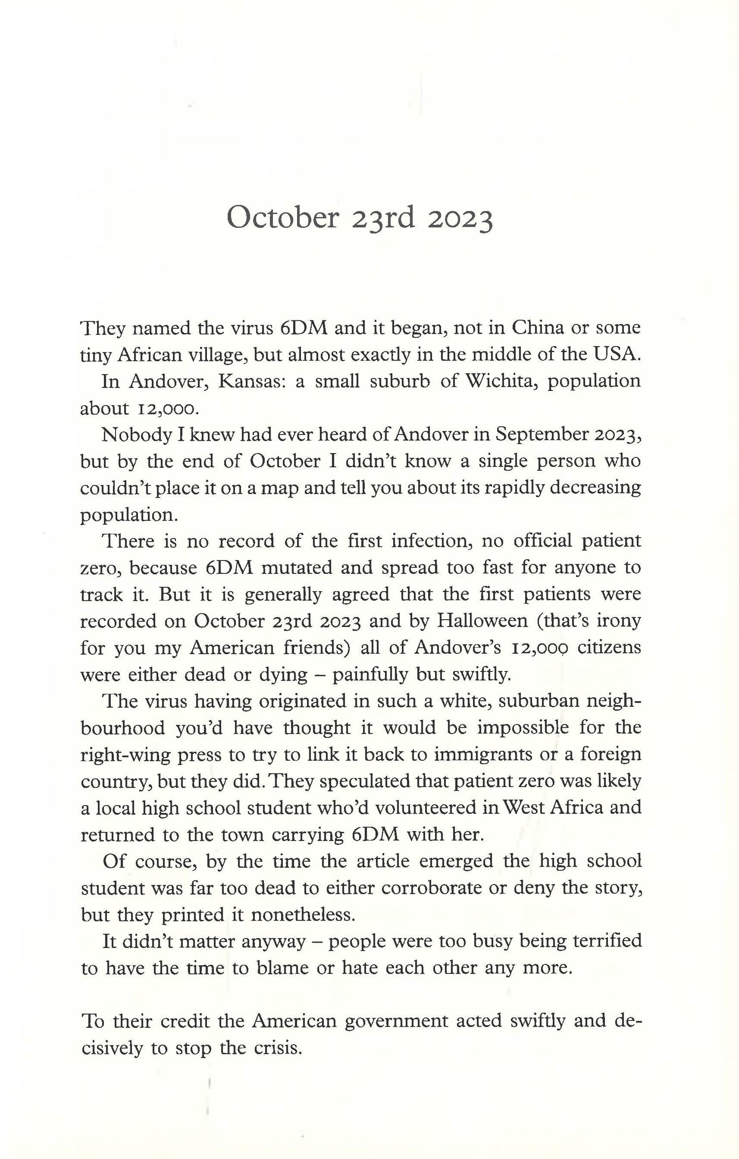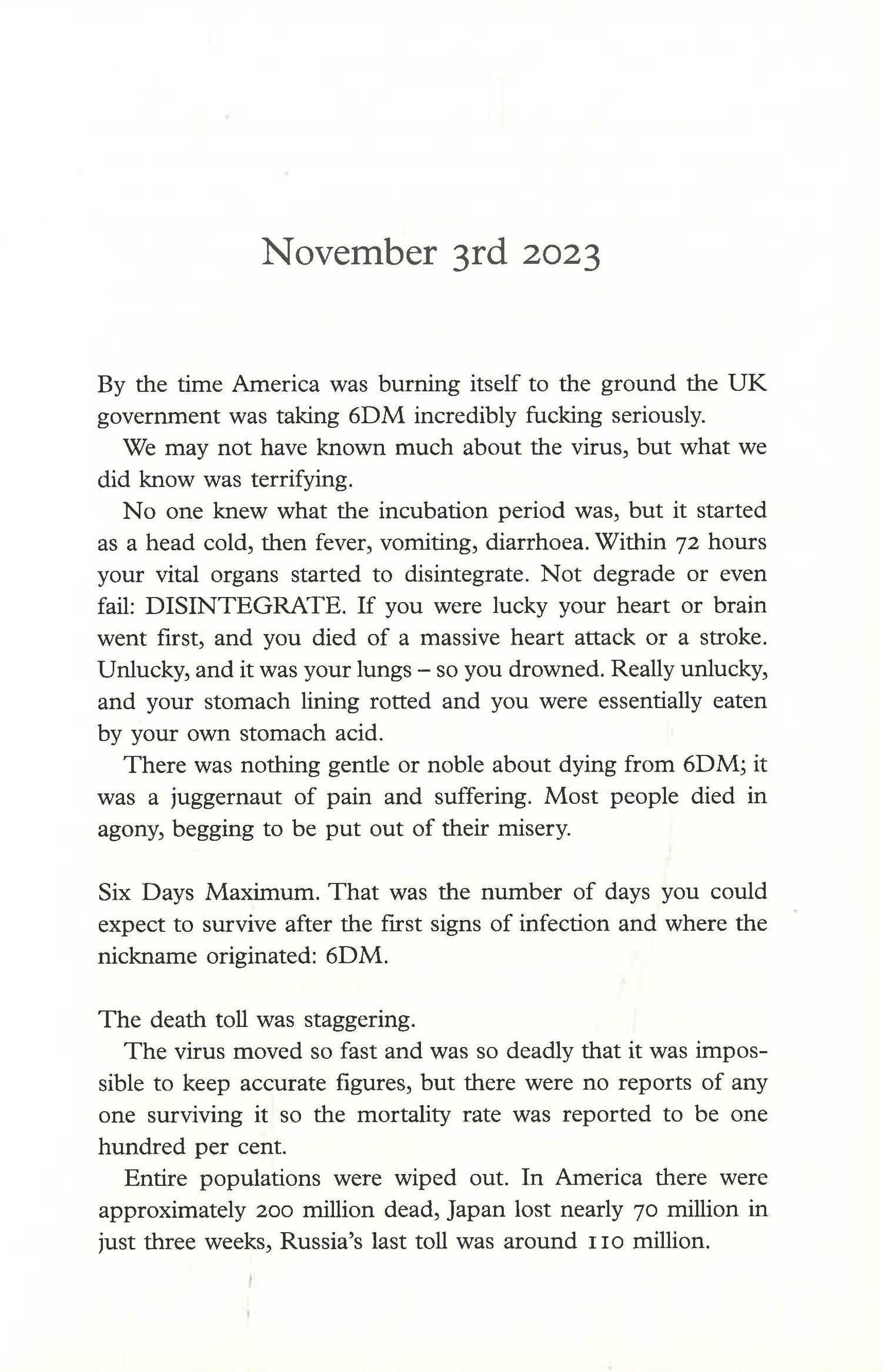 It's November 2023. The human race has been wiped out by the 6DM virus (Six Days Maximum - the longest you've got before your body destroys itself). The end of the world as we know it.