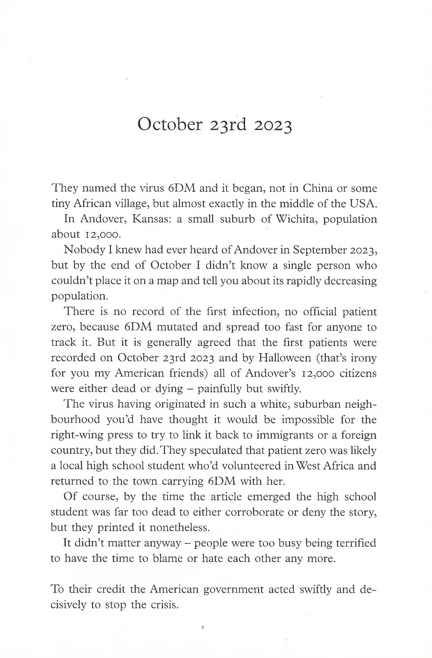 Now, with only an abandoned golden retriever for company, she must travel through burning cities, avoiding rotting corpses and ravenous rats on a final journey to discover if she really is the last surviving person on earth.