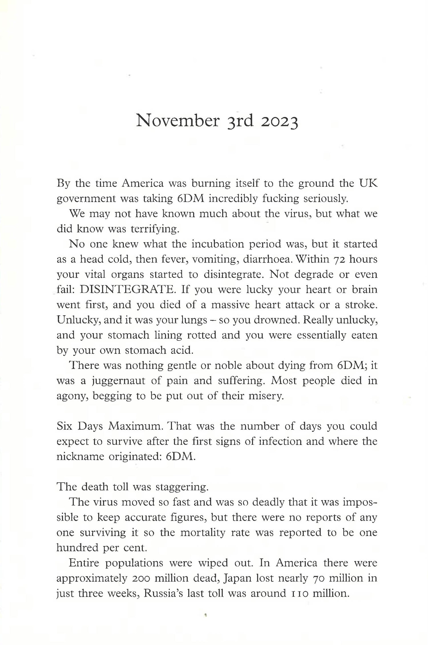 The human race has been wiped out by a virus called 6DM ('Six Days Maximum' - the longest you've got before your body destroys itself).