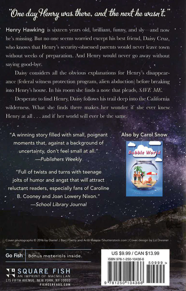 Henry Hawking is sixteen years old, brilliant, funny, and sly and now he's missing. But no one seems worried except his best friend, Daisy Cruz, who knows that Henry's security obsessed parents would never leave town without taking proper precautions. And Henry would never go away without saying good-bye. Daisy considers all the obvious explanations for Henry's disappearance (federal witness protection program, alien abduction) before breaking into Henry's house. In his room, she finds a note that pleads, Save Me. Desperate to find Henry, Daisy follows his trail deep into the California wilderness. What she finds there makes her wonder if she ever knew Henry at all...and if the world as she knows it will ever be the same.