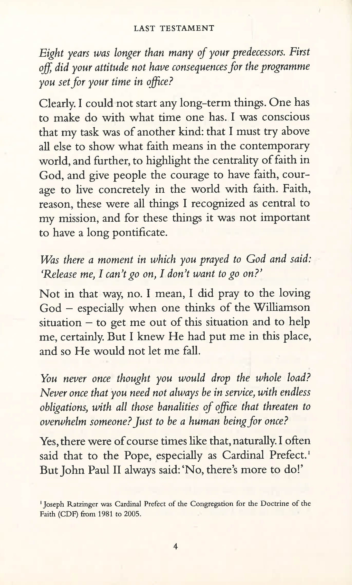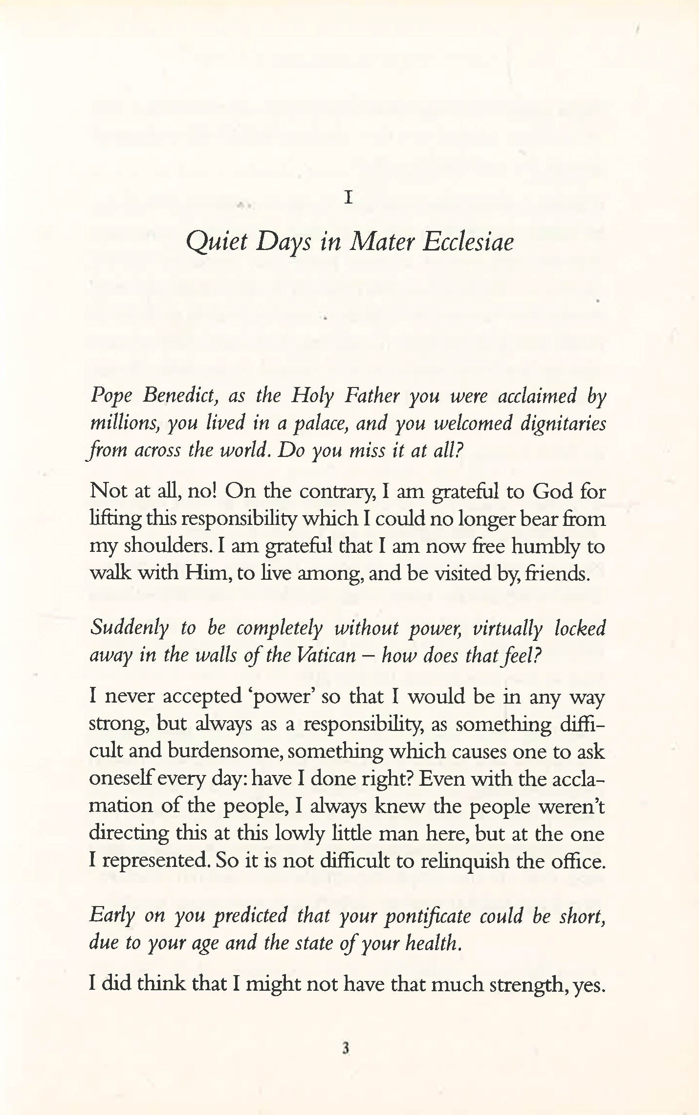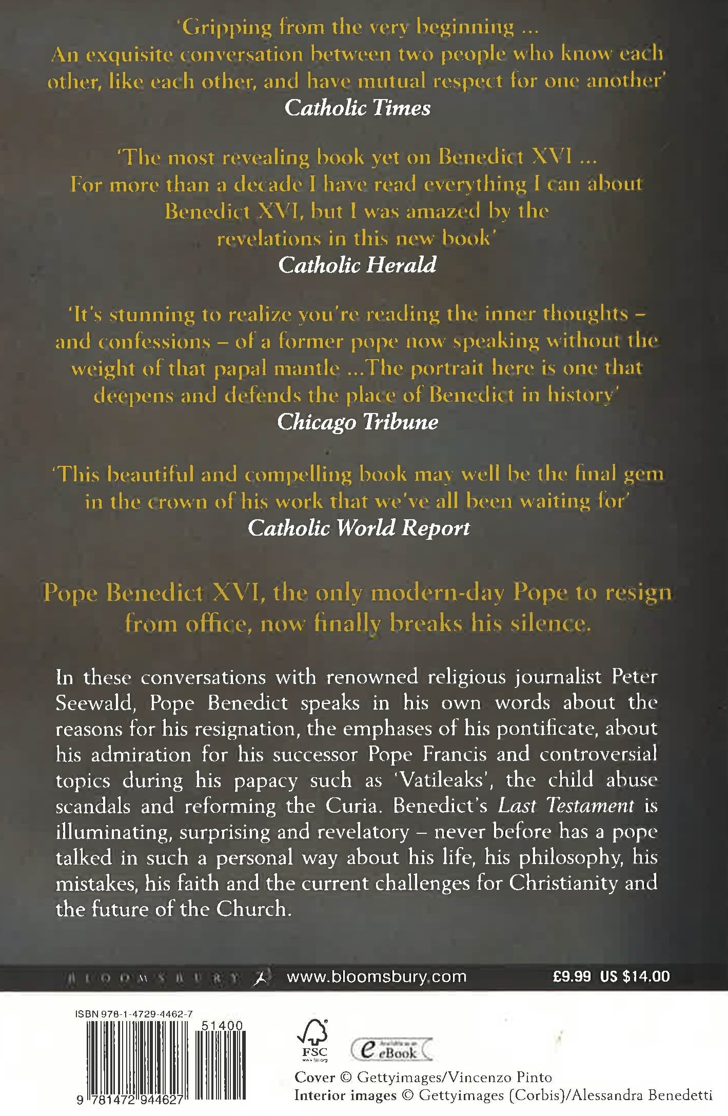 In these conversations with renowned religious journalist Peter Seewald, Pope Benedict speaks in his own words about the reasons for his resignation, the emphases of his pontificate about his admiration for his successor Pope Francis and controversial topics during his papacy. Benedict's Last Testament is illuminating, surprising and revelatory - never before has a pope talked in such a personal way about his life, his philosophy, his mistakes, his faith and the current challenges for Christianity and the future of the Church.