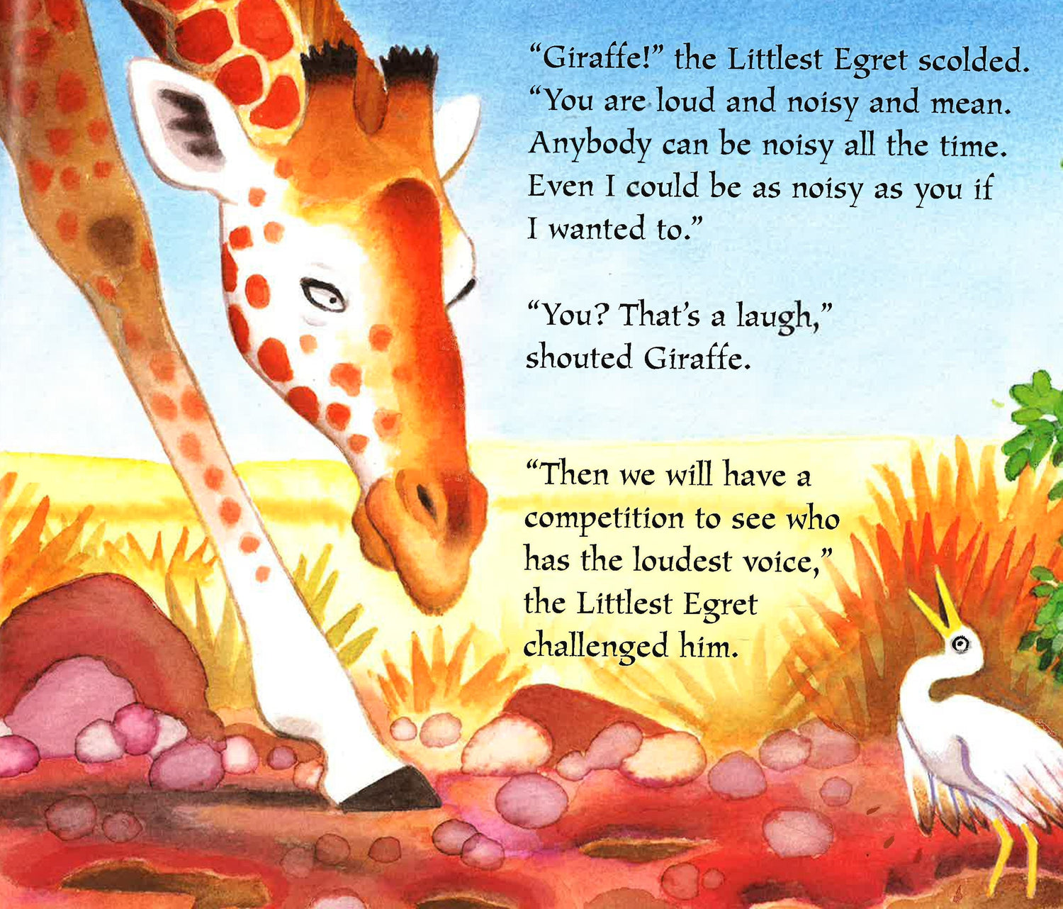 In the days long ago, Giraffe was the noisiest animal on the Great African Plain. He shouted a lot and he laughed all the time. This is the story of how the littlest Egret proved to Laughing Giraffe that you don't need to be loud to be heard.