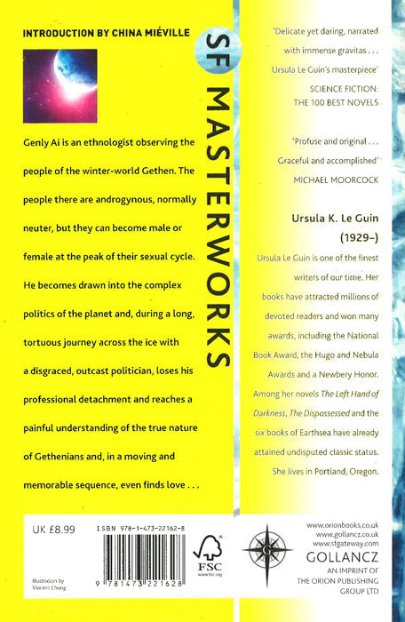 Genly Ai is an ethnologist observing the people of the planet Gethen, a world perpetually in winter. The people there are androgynous, normally neuter, but they can become male ot female at the peak of their sexual cycle. They seem to Genly Ai alien, unsophisticated and confusing. But he is drawn into the complex politics of the planet and, during a long, tortuous journey across the ice with a politician who has fallen from favour and has been outcast, he loses his professional detachment and reaches a painful understanding of the true nature of Gethenians and, in a moving and memorable sequence, even finds love...