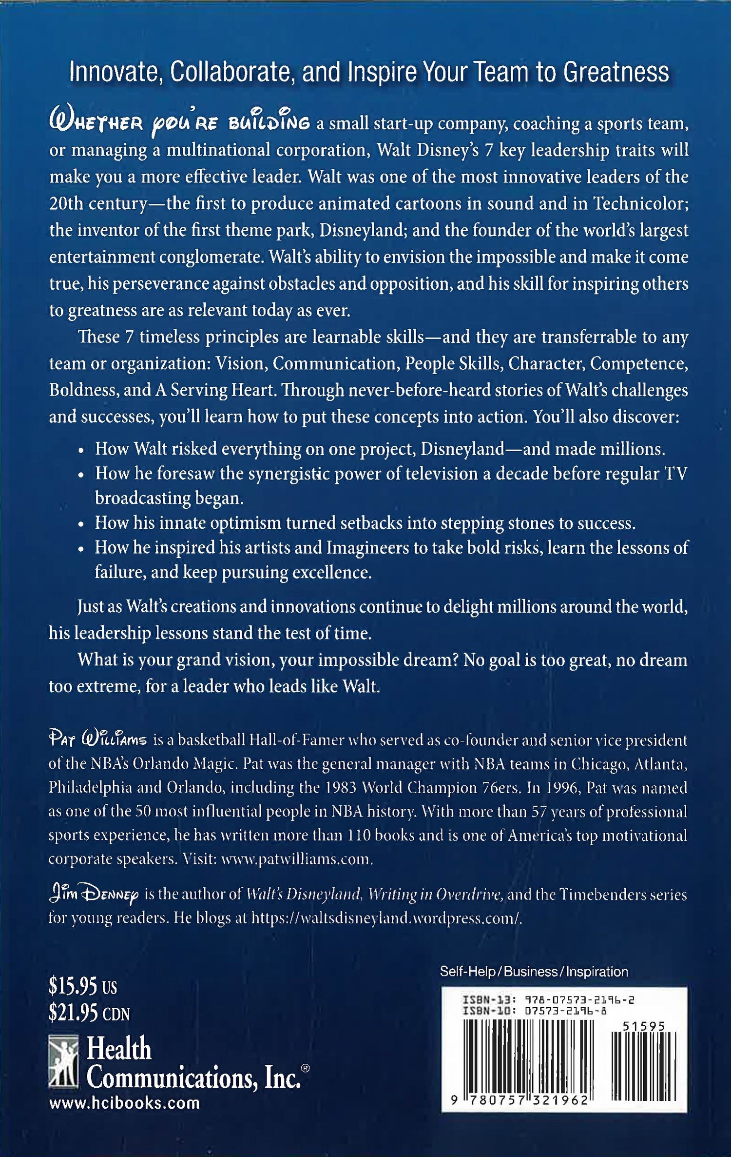 Author Pat Williams began studying the life and leadership example of Walt Disney as he struggled to build an NBA franchise, the Orlando Magic. Since he was trying to accomplish a goal similar to so many of Walt's—starting with nothing and building a dream from the ground up—he realized that Walt could teach him what he needed to know. And indeed he did.