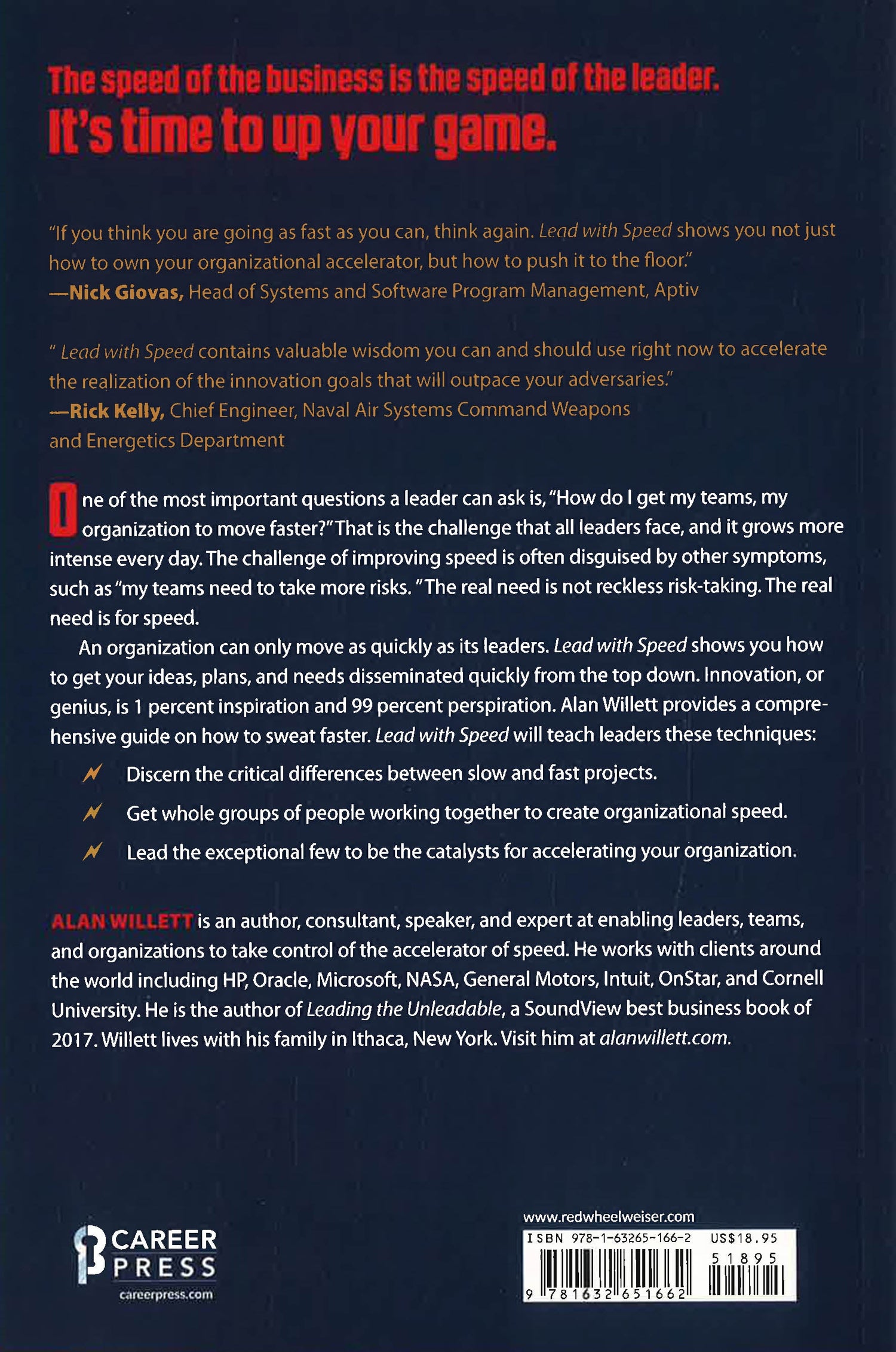 The speed of the business is the speed of the leader. It’s time to up your game. One of the most important questions a leader can ask themselves is: “How do I get my teams, my organization to move faster?”That is the challenge that all leaders face. This challenge grows more intense every day. Lead with Speed is the answer. This problem of speed is often disguised by other symptoms, such as “my projects cannot make an accurate prediction of when they will be done” or the stated need of “my teams need to take more risks.” The real need is not reckless risk-taking that will lead to even more problems and finishing even later. The real need is for speed.An organization can only move as quickly as its leaders. Lead with Speed shows you how to get your ideas, plans, and needs disseminated quickly from the top down. Innovation, or genius, is 1 percent inspiration and 99 percent perspiration. Alan Willett provides a comprehensive guide on how to sweat faster. You will learn how to:Develop the mind-set required for leading with speed•Discern the critical differences between slow and fast projects•Notice what you as a leader need to do to create those differences•Create a targeting system for speed•Get whole groups of people working together to create organizational speed•Lead the exceptional few to be the catalyst for accelerating your organization