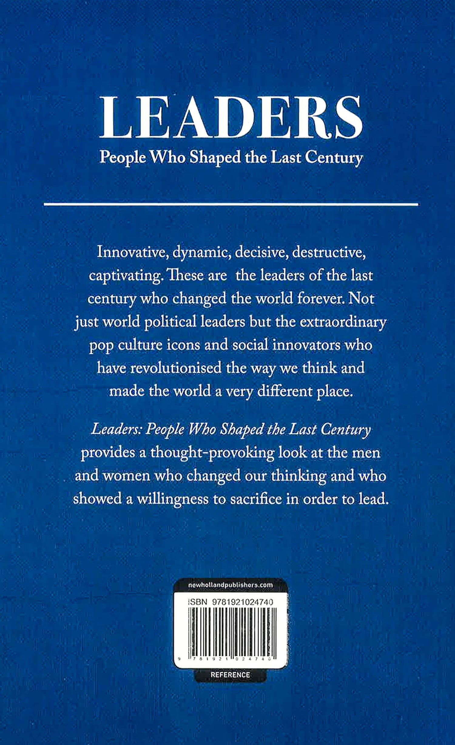 The leaders that are remembered by history both define the world they live in and change that world forever. Whether their leadership is inspirational, innovative, decisive or ultimately destructive, we have a lot to learn from the lives and achievements of the eclectic group of people featured in this wonderful book. Leaders in the Last Century is a collection of fifty of the most important politicians, pop culture icons and social innovators of the past 100 years. From Hitler to Obama, Lennon to Madonna and Attenborough to Gates, each of the people featured in this book changed the world hellip; either for better or for worse. Featuring 50 politicians, pop icons and innovators of the past 100 years.