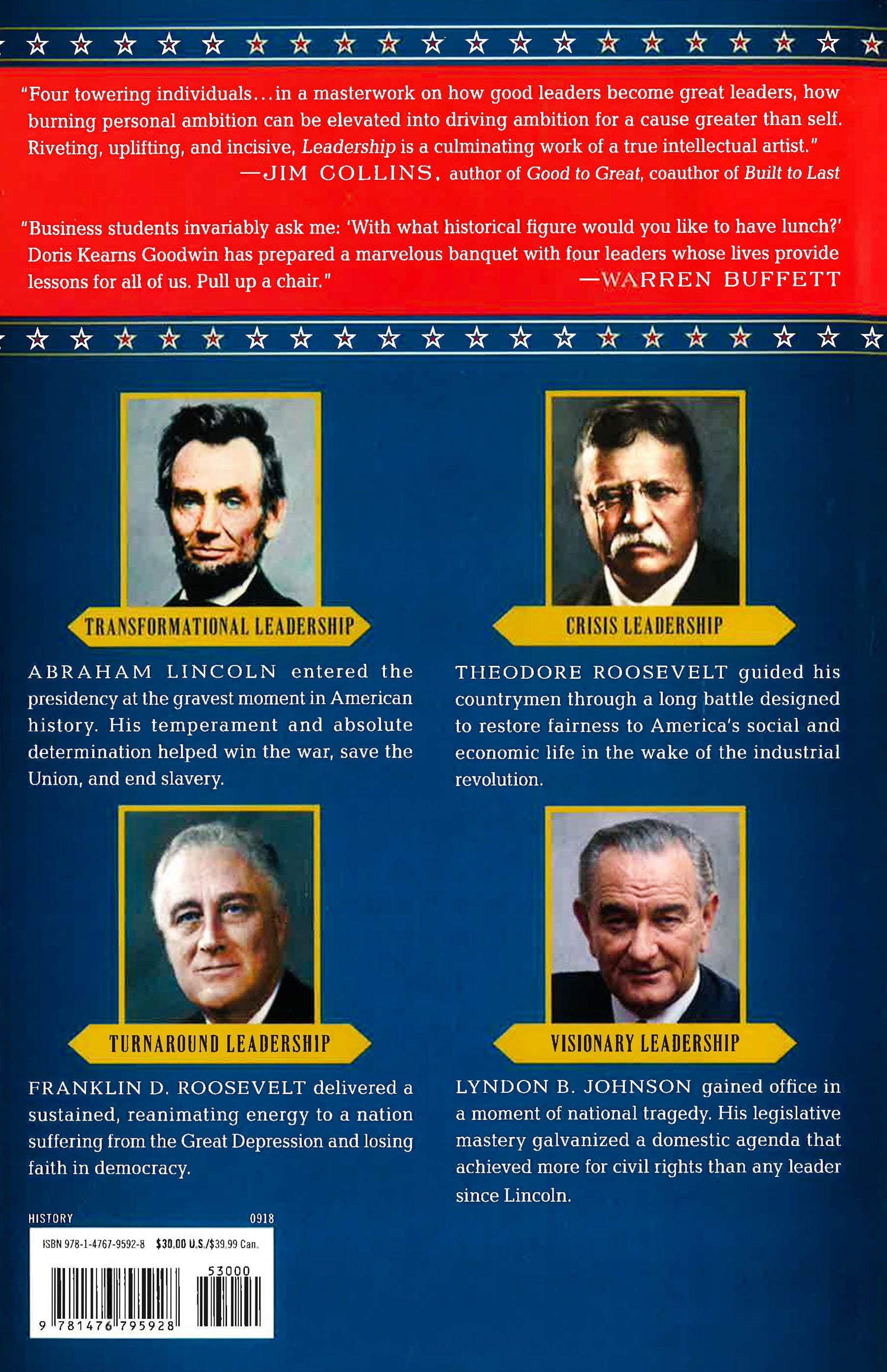 NEW YORK TIMES BESTSELLER "After five decades of magisterial output, Doris Kearns Goodwin leads the league of presidential historians. Insight is her imprint."--USA TODAY "A book like Leadership should help us raise our expectations of our national leaders, our country and ourselves."--The Washington Post "We can only hope that a few of Goodwin's many readers will find in her subjects' examples a margin of inspiration and a resolve to steer the country to a better place."--The New York Times Book Review In this culmination of five decades of acclaimed studies in presidential history, Pulitzer Prize-winning author Doris Kearns Goodwin offers an illuminating exploration of the early development, growth, and exercise of leadership. Are leaders born or made? Where does ambition come from? How does adversity affect the growth of leadership? Does the leader make the times or do the times make the leader? In Leadership, Goodwin draws upon the four presidents she has studied most closely--Abraham Lincoln, Theodore Roosevelt, Franklin D. Roosevelt, and Lyndon B. Johnson (in civil rights)--to show how they recognized leadership qualities within themselves and were recognized as leaders by others. By looking back to their first entries into public life, we encounter them at a time when their paths were filled with confusion, fear, and hope. Leadership tells the story of how they all collided with dramatic reversals that disrupted their lives and threatened to shatter forever their ambitions. Nonetheless, they all emerged fitted to confront the contours and dilemmas of their times. No common pattern describes the trajectory of leadership. Although set apart in background, abilities, and temperament, these men shared a fierce ambition and a deep-seated resilience that enabled them to surmount uncommon hardships. At their best, all four were guided by a sense of moral purpose. At moments of great challenge, they were able to summon their talents to enlarge the opportunities and lives of others. This seminal work provides an accessible and essential road map for aspiring and established leaders in every field. In today's polarized world, these stories of authentic leadership in times of apprehension and fracture take on a singular urgency. *This book may have remainder mark