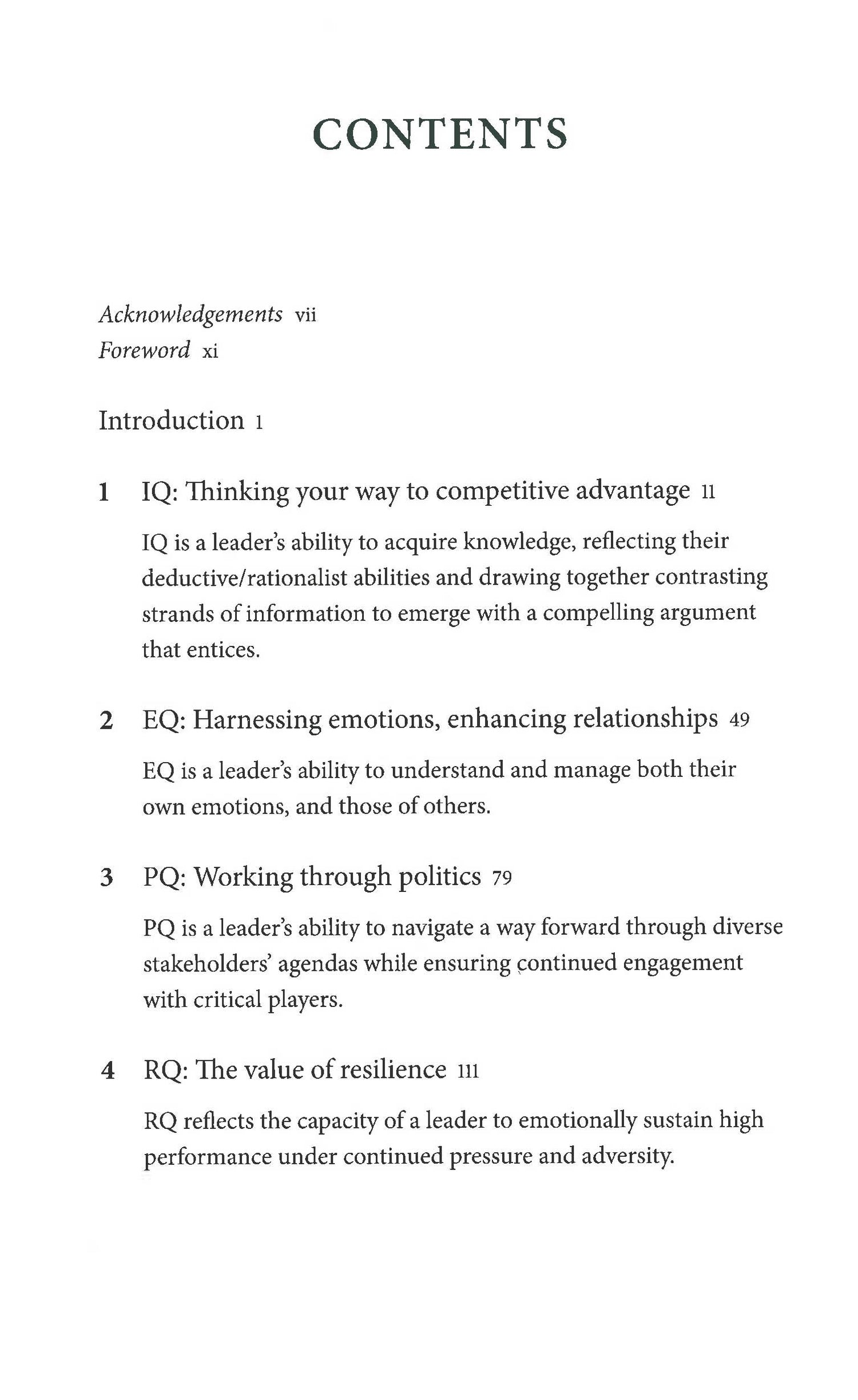In today's complex corporate world, contemporary governance calls for a varied and versatile cognitive approach to problems - demanding times require nimble minds and rounded perspectives. The authors' research has identified five key leadership intelligences - the 5Qs - which high-performing leaders need to simultaneously employ in order to achieve transformational change. These are: IQ (cognitive intelligence); EQ (emotional intelligence); PQ (political intelligence); RQ (resilience quotient); and MQ (moral intelligence). The 5Qs come together to inform every aspect of leadership, and each of them can, in different ways, be nurtured and practised through learning and development. Andrew Kakabadse and Ali Qassim Jawad have tested the 5Qs on leaders worldwide, applying them at all levels of leadership in order to explore the combinations of intelligences needed to become a well-rounded, effective leader in any situation.