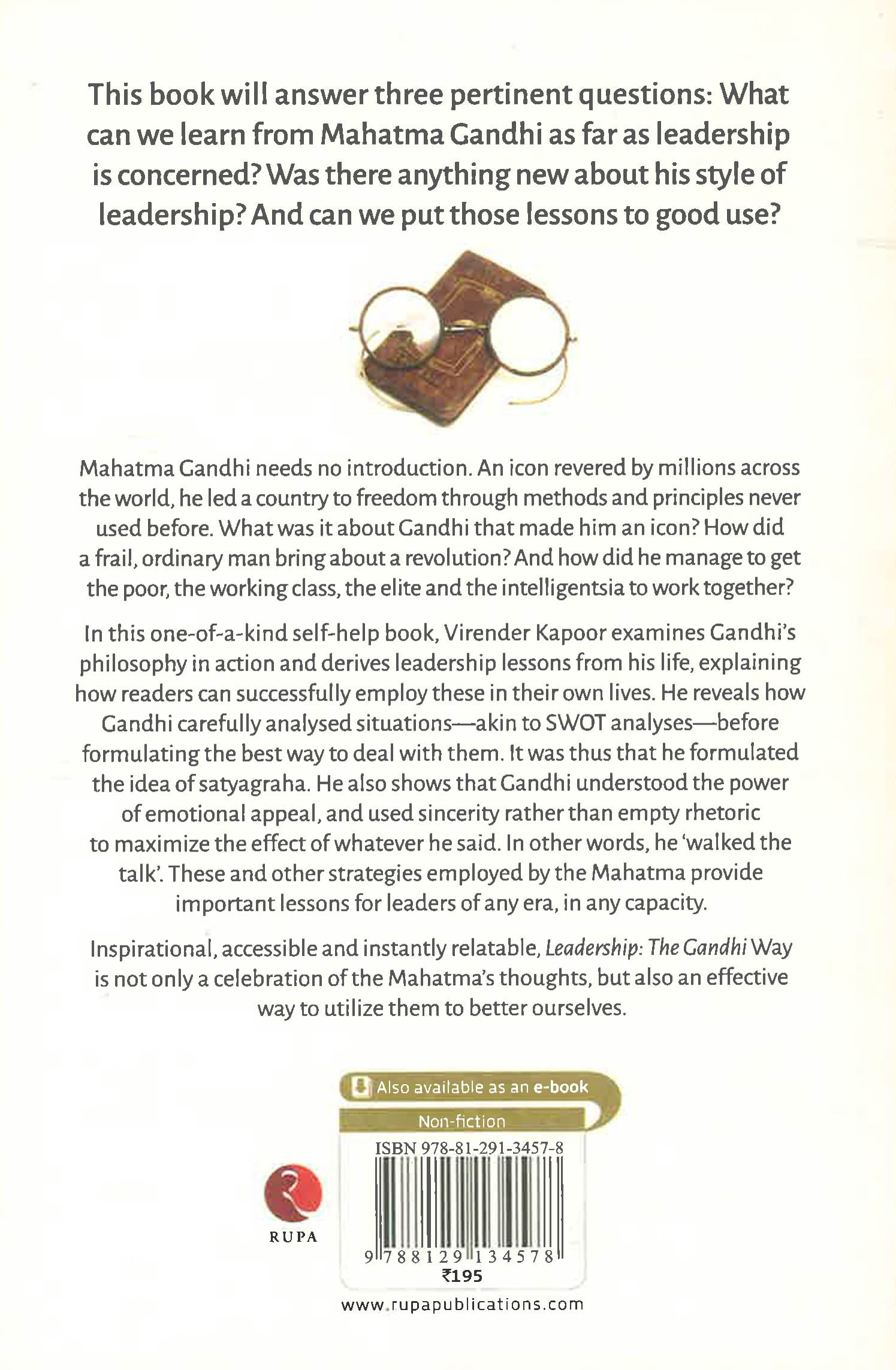What can we learn from Mahatma Gandhi as far as leadership is concerned? Mahatma Gandhi needs no introduction. An icon revered by millions across the world, he led a country to freedom through methods and principles never used before. What was it about Gandhi that made him an icon? How did a frailordinary man bring about a revolution? And how did he manage to rope in the poor, the working class, the elite and the intelligentsia to work together? In this one-of-a-kind self-help book, Virender Kapoor analyses Gandhi's methods and derives leadership lessons from his life, explaining how readers can successfully employ these in their own lives. He reveals how Gandhi carefully analysed situations, the precursor of SWOT analysis before formulating the best way to deal with them. It was thus that he formulated the idea of Satyagraha. He also shows that Gandhi understood the power of emotional appeal and used sincerity rather than empty rhetoric to maximize on this. In other words, he 'walked the talk'. These and other strategies by Gandhi provide important lessons for leaders of any era, in any capacity. The key, he reveals, is to adapt, rather than adopt, Gandhi's philosophy in action.