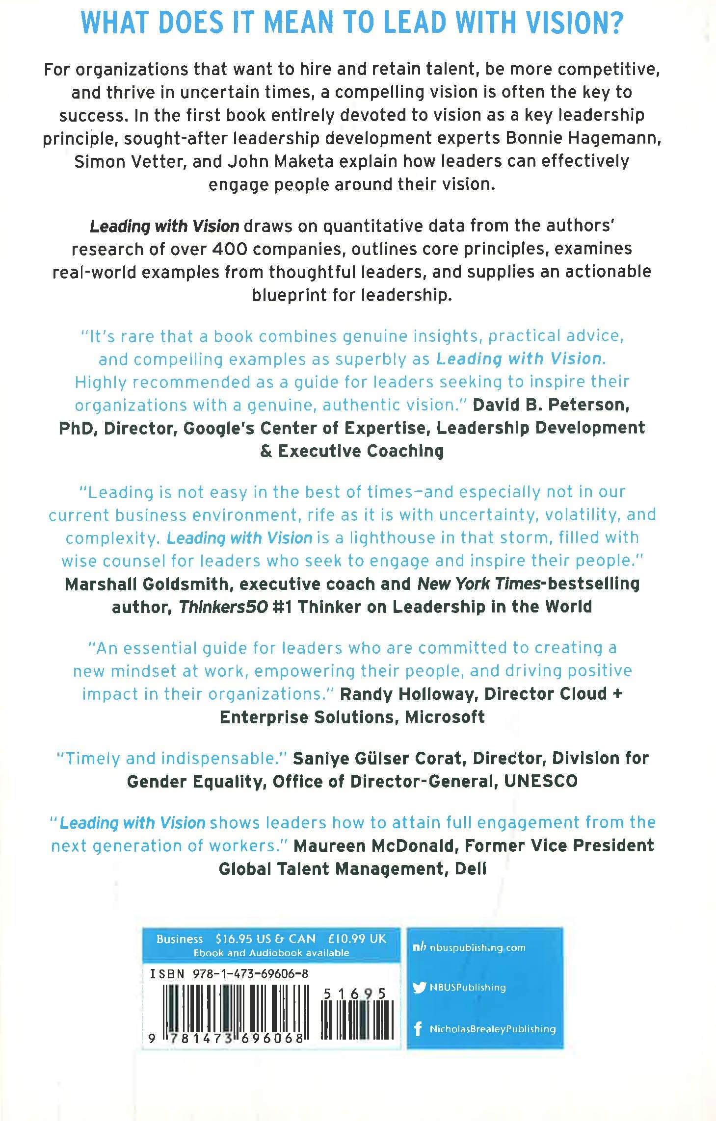 What does it mean to lead with vision? In the first book devoted entirely to vision as a key leadership principle, the authors delve deeply into the notion that a compelling vision that motivates and inspires is a true differentiator for organizations that want to hire and retain talent, be more competitive, and thrive in uncertain times. But a compelling vision on its own is not enough, which is why the authors, sought-after leadership development experts globally, provide readers with detailed analysis of the essential things leaders must do to effectively engage the workforce around that vision: embody courage, forge clarity, build connectedness, and shape culture.