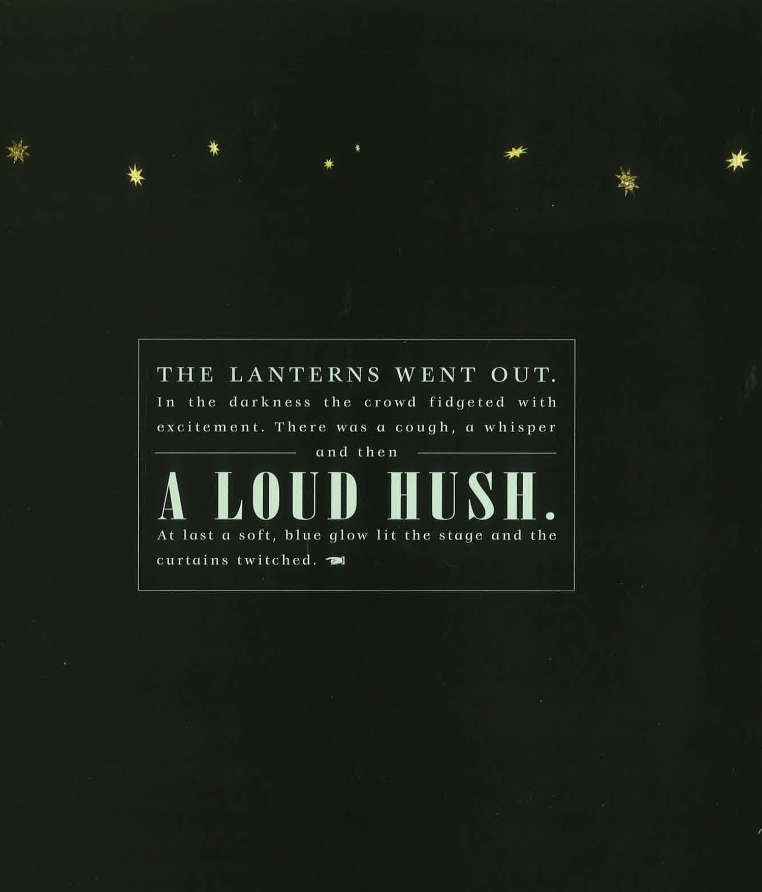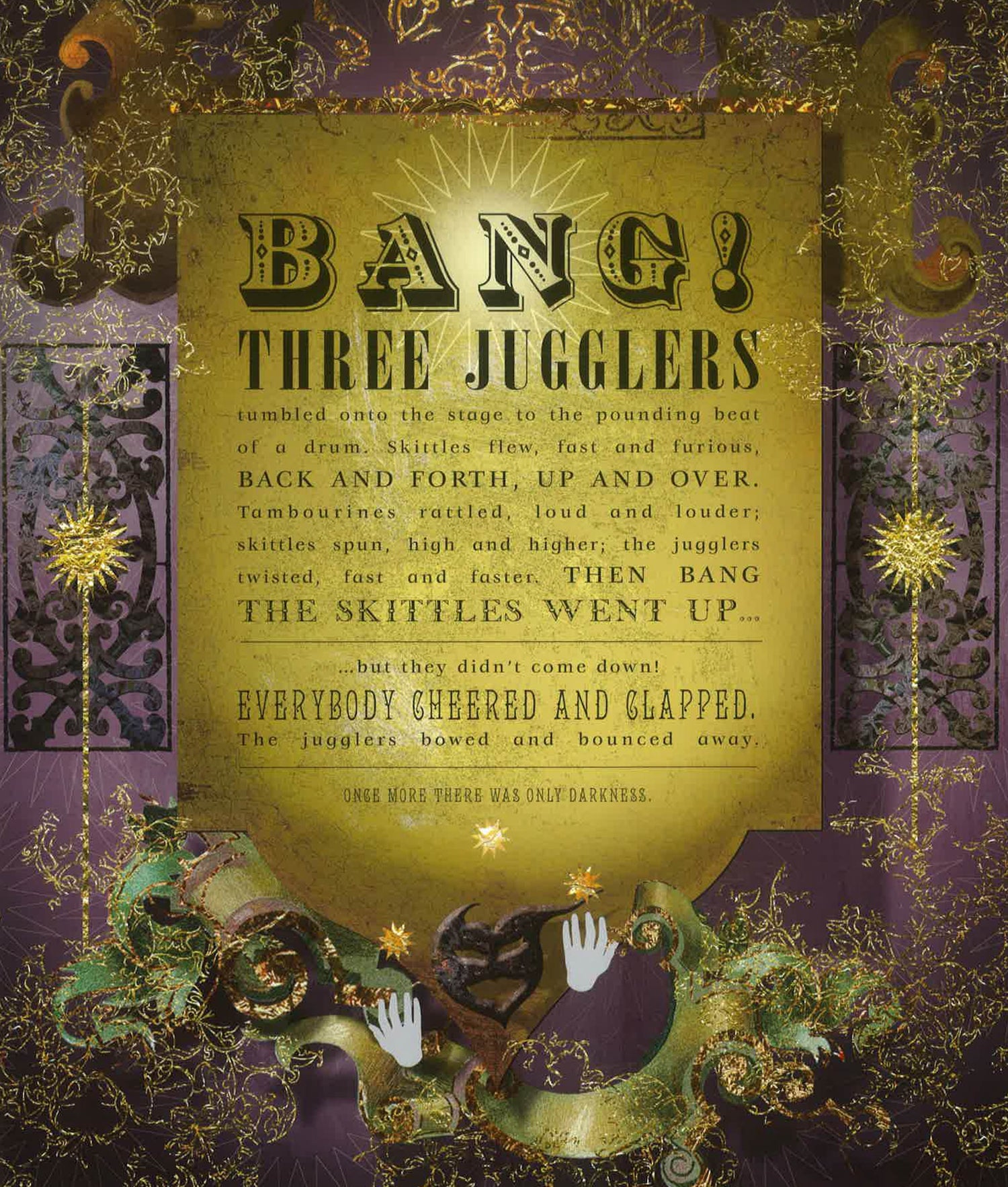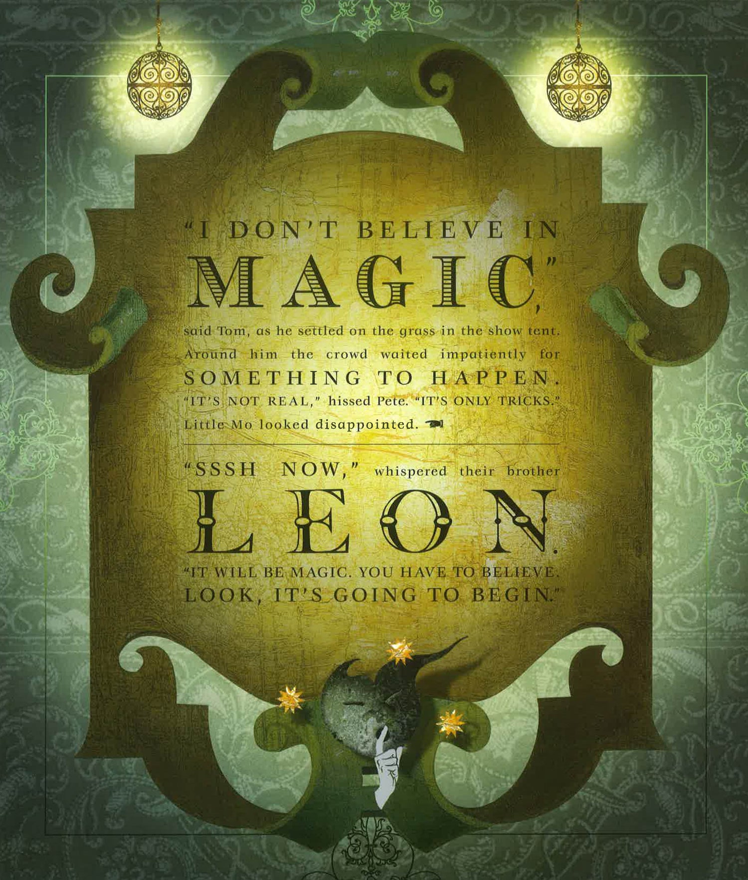 Wanting to prove to his brothers and sister that magic really exists, Leon volunteers to be in Abdul Kazam's magic show and gets transported to a mysterious world. Filled with rabbits, doves, playing cards and magician's assistants - among other things - if a magician can make it disappear, it will end up in the Place Between! When Leon returns, not only do his brothers and sister believe, but we do too. With diecut holes into and out of the Place Between, the reader takes a journey right through the pages of the book, into the mysterious world of Grahame Baker-Smith's breath-taking illustrations.