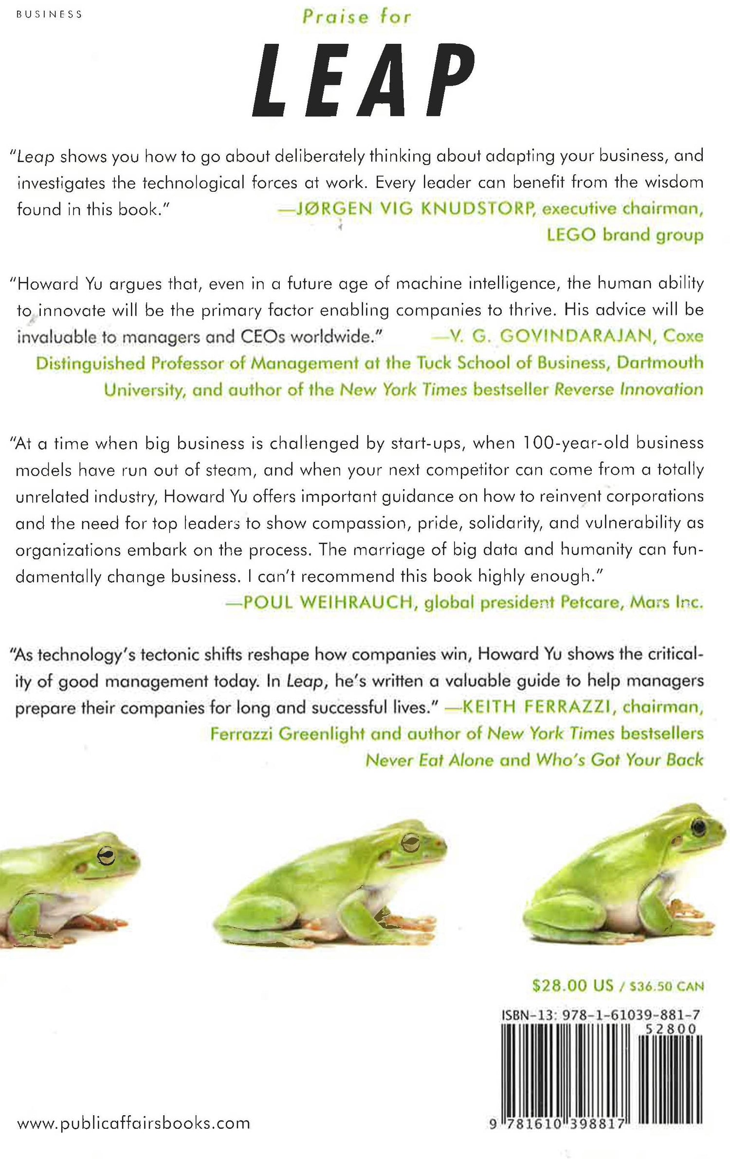 Using riveting case studies of successful leaps and tragic falls, Yu illustrates five principles to success that span a wide range of industries, countries, and eras. Learn about how P&G in the 19th century made the leap from handcrafted soaps and candles to mass production of its signature brand Ivory, leaped into the new fields of consumer psychology and advertising, then leaped again, at the risk of cannibalizing its core product, into synthetic detergents and won with Tide in 1946. Learn about how Novartis and other pharma pioneers stayed ahead by making leaps from chemistry to microbiology to genomics in drug discovery; and how forward-thinking companies, including China's largest social media app--WeChat, Tokyo-based Internet service provider Recruit Holdings, and Illinois-headquartered John Deere are leaping ahead by leveraging the emergence of ubiquitous connectivity, the inexorable rise of intelligent machines, and the rising importance of managerial creativity.