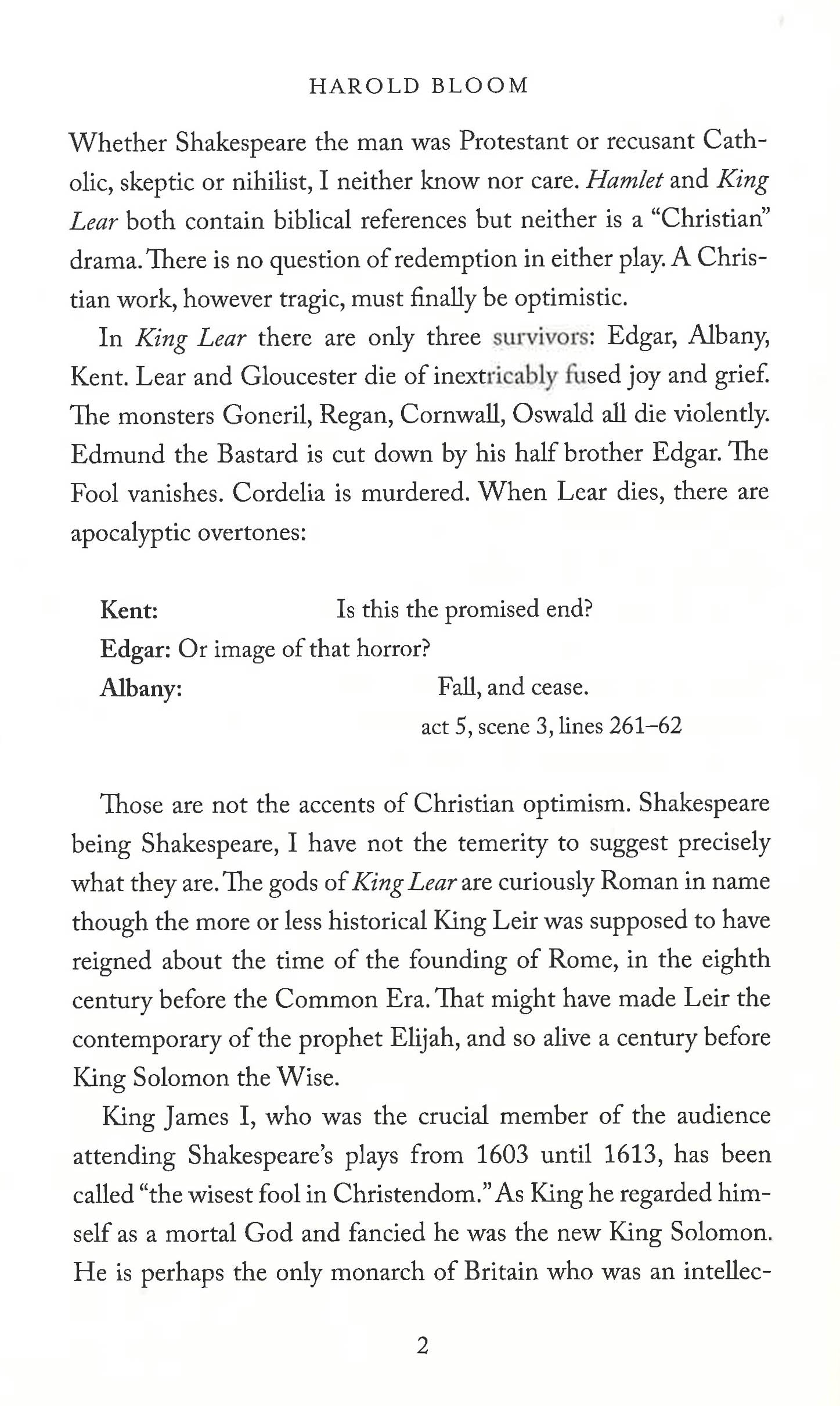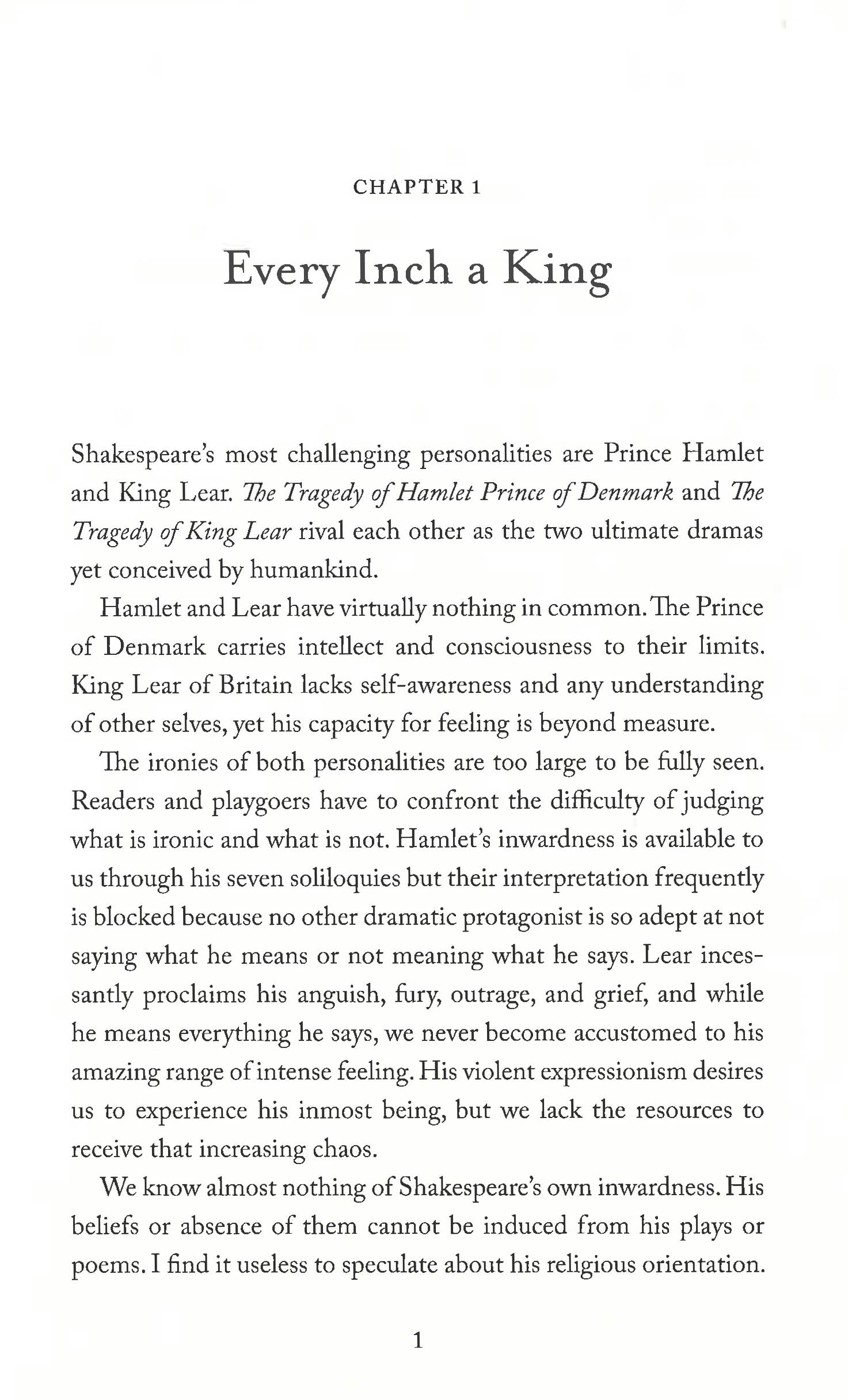 Harold Bloom, regarded by some as the greatest Shakespeare scholar of our time, presents an intimate, wise, deeply compelling portrait of King Lear-the third in his series of five short books about the great playwright's most significant personalities, hailed as Bloom's "last love letter to the shaping spirit of his imagination" on the front page of The New York Times Book Review. King Lear is perhaps the most poignant character in literature. The aged, abused monarch-a man in his eighties, like Harold Bloom himself-is at once the consummate figure of authority and the classic example of the fall from majesty. He is widely agreed to be William Shakespeare's most moving, tragic hero. Award-winning writer and beloved professor Harold Bloom writes about Lear with wisdom, joy, exuberance, and compassion. He also explores his own personal relationship to the character: Just as we encounter one Emma Bovary or Hamlet when we are seventeen and another when we are forty, Bloom writes about his shifting understanding-over the course of his own lifetime-of Lear, so that this book also explores an extraordinarily moving argument for literature as a path to and a measure of our humanity. Bloom is mesmerizing in the classroom, wrestling with the often tragic choices Shakespeare's characters make. He delivers that kind of exhilarating intimacy, pathos, and clarity in Lear.
