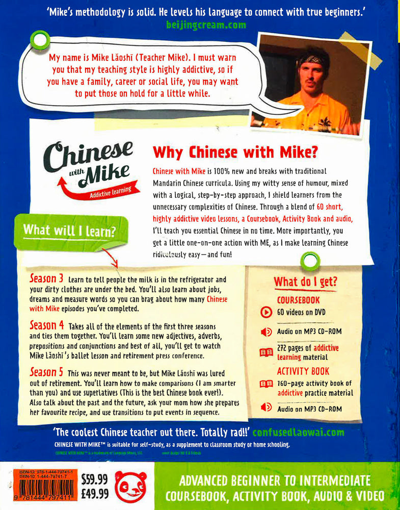 Chinese with Mike is 100% new and breaks with traditional Chinese curricula. Mike's humour, mixed with his logical, step-by-step approach shields learners from the unnecessary complexities of Mandarin Chinese. In this complete learning package you'll get 60 short, highly addictive video lessons on DVD, a Coursebook, an Activity Book and audio. You'll acquire essential Chinese with confidence. More importantly, you get a little one-on-one time with Mike, as he makes learning Chinese ridiculously easy-and fun!