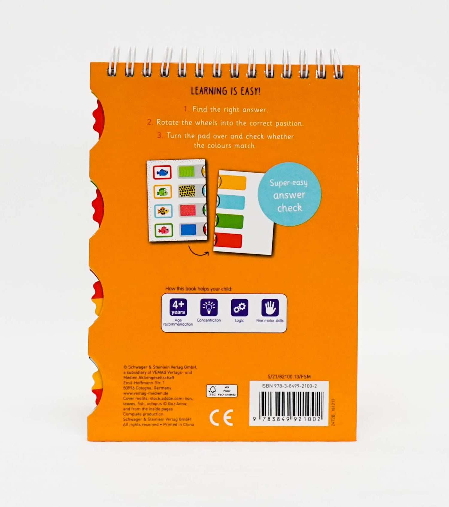 This educational pad makes it easy to find the right answer. Rotate the wheels into the correct position. Turn the pad over and check whether the colours match.