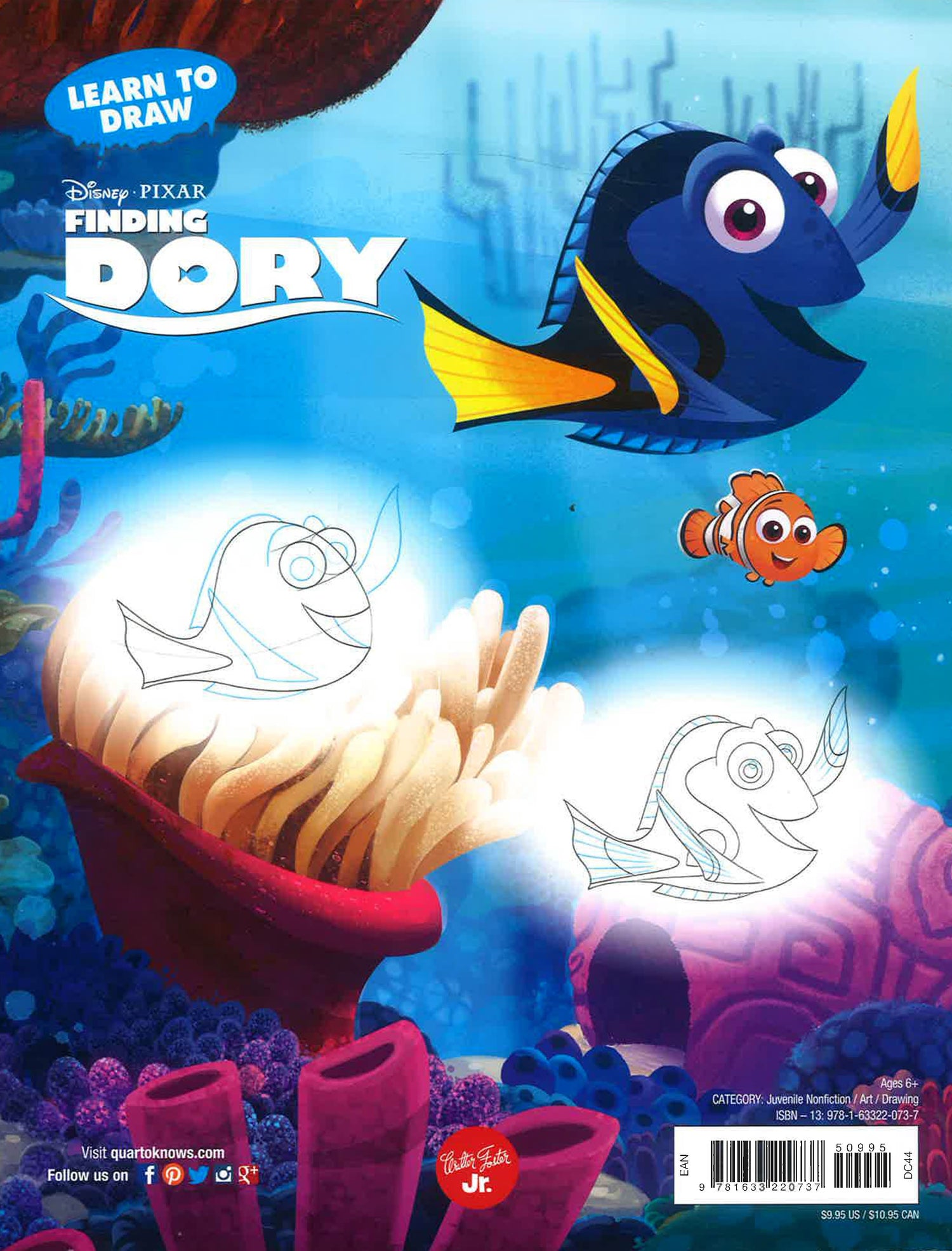 Learn to Draw Disney•Pixar’s Finding Dory features all the popular characters from Finding Dory. With just a bit of practice, even beginning artists can draw all the characters in this 64-page book. It features easy step-by-step instructions for drawing baby Dory, adult Dory, her parents Charlie and Jenny, her clownfish friends Marlin and Nemo, the septopusHank, Dory’s old whale shark friend Destiny, Bailey the beluga whale, some sea lions (Fluke, Rudder, and Gerald), Becky the loon, and one of the cutest, cuddliest otters ever! All you'll need to start drawing are a few supplies. And the easy-to-follow instructions will guide you through each step, showing you how each step builds upon the last to create a finished piece of art.
