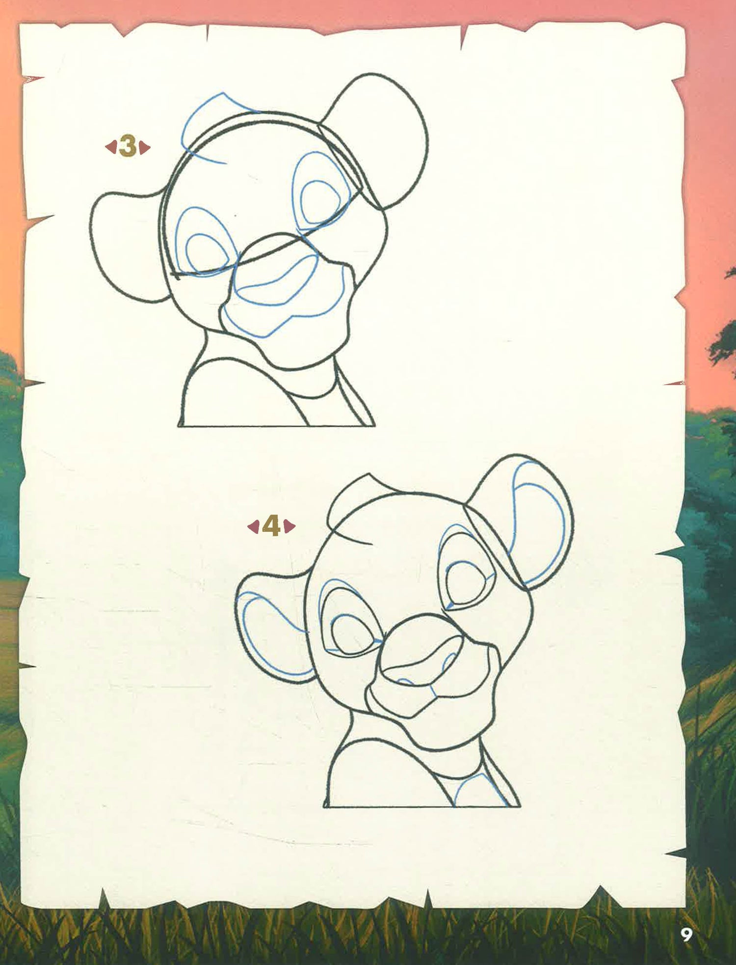The easy-to-follow instructions in this book will guide you through the drawing process; each step builds upon the last until the character is complete. You just need to grab a pencil, a piece of paper, and your copy of Learn to Draw Disney The Lion King; then flip to the character you want to draw. You’ll draw the basic shapes shown in step one, and move on to step two, step three, and keep going! The new lines in each step are shown in blue, so you’ll know exactly what to draw. After adding all the details in each step, darken the lines you want to keep and erase the rest. Finally, add color to your drawing with felt-tip markers, colored pencils, watercolors, or acrylic paints. If your drawing isn’t perfect, hakuna matata! You can draw the characters over and over, getting better with each try.